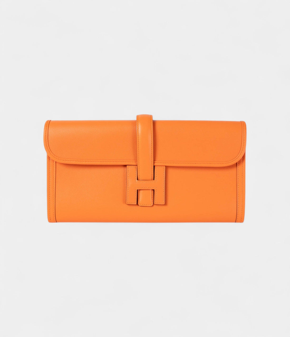 The Hermès Jige 29 Clutch in Orange Swift leather is a bold and vibrant accessory...