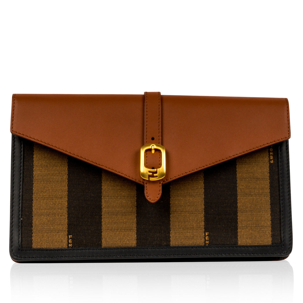 Fendi presents their fashionable but functional Pequin clutch, crafted from brown leather and striped fabric....