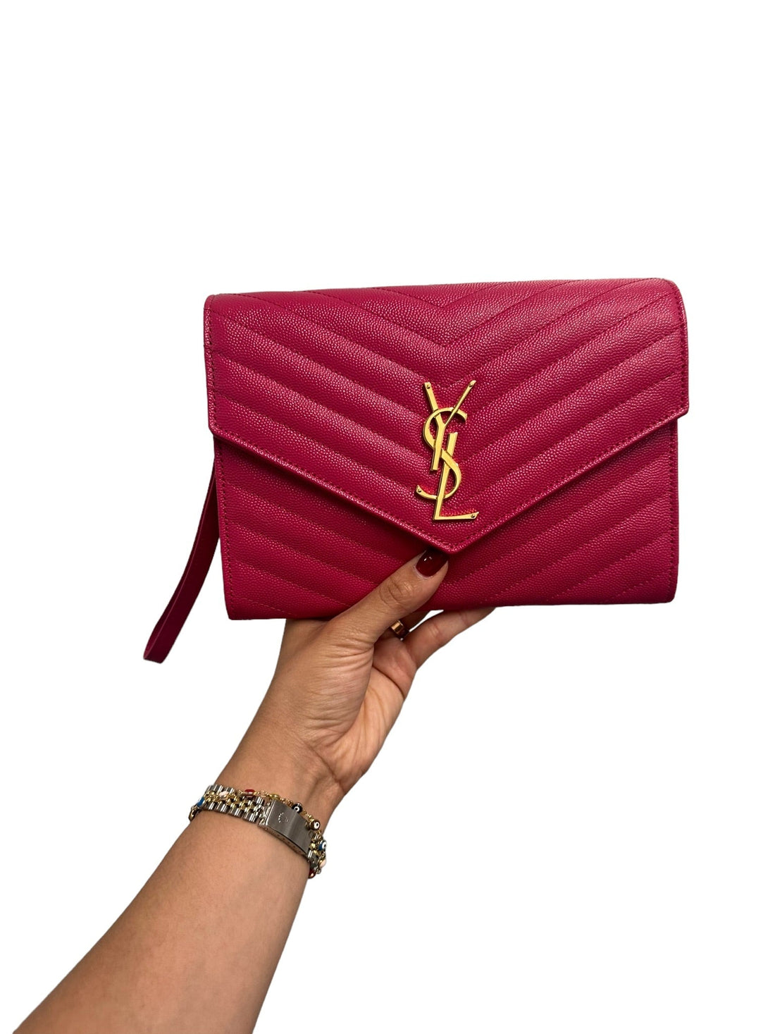 Experience luxury at its finest with the SAINT LAURENT Grain De Poudre Chevron Pouch Clutch....
