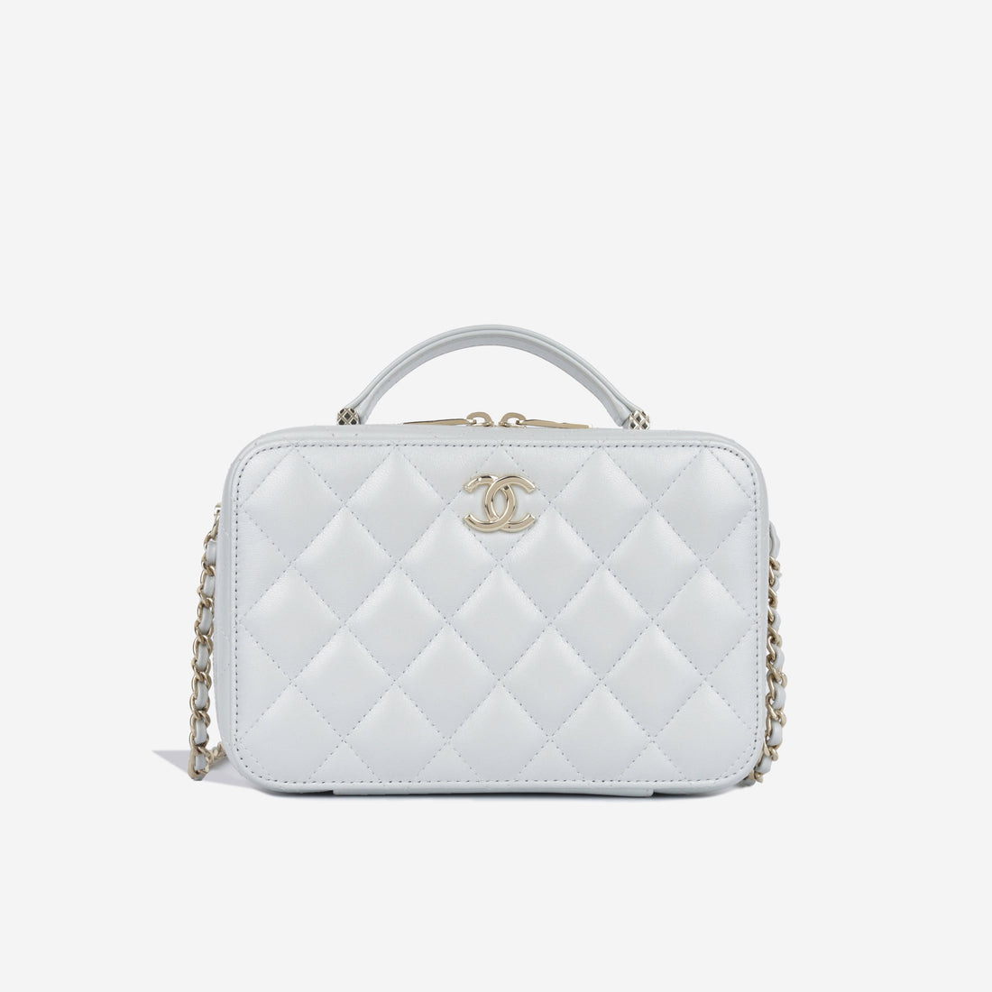 Carefully crafted from iridescent ice blue lambskin, this little beauty is an absolute necessity in any luxury handbag...