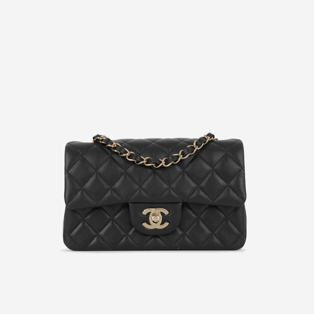 Crafted from luxurious lambskin, this rare Chanel So Black Mini Rectangular Classic Flap is a...