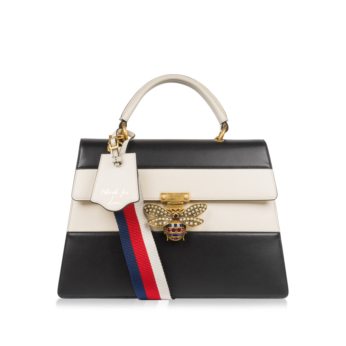 Crafted from black and white striped leather, the stunning Queen Margaret bag from Gucci is...