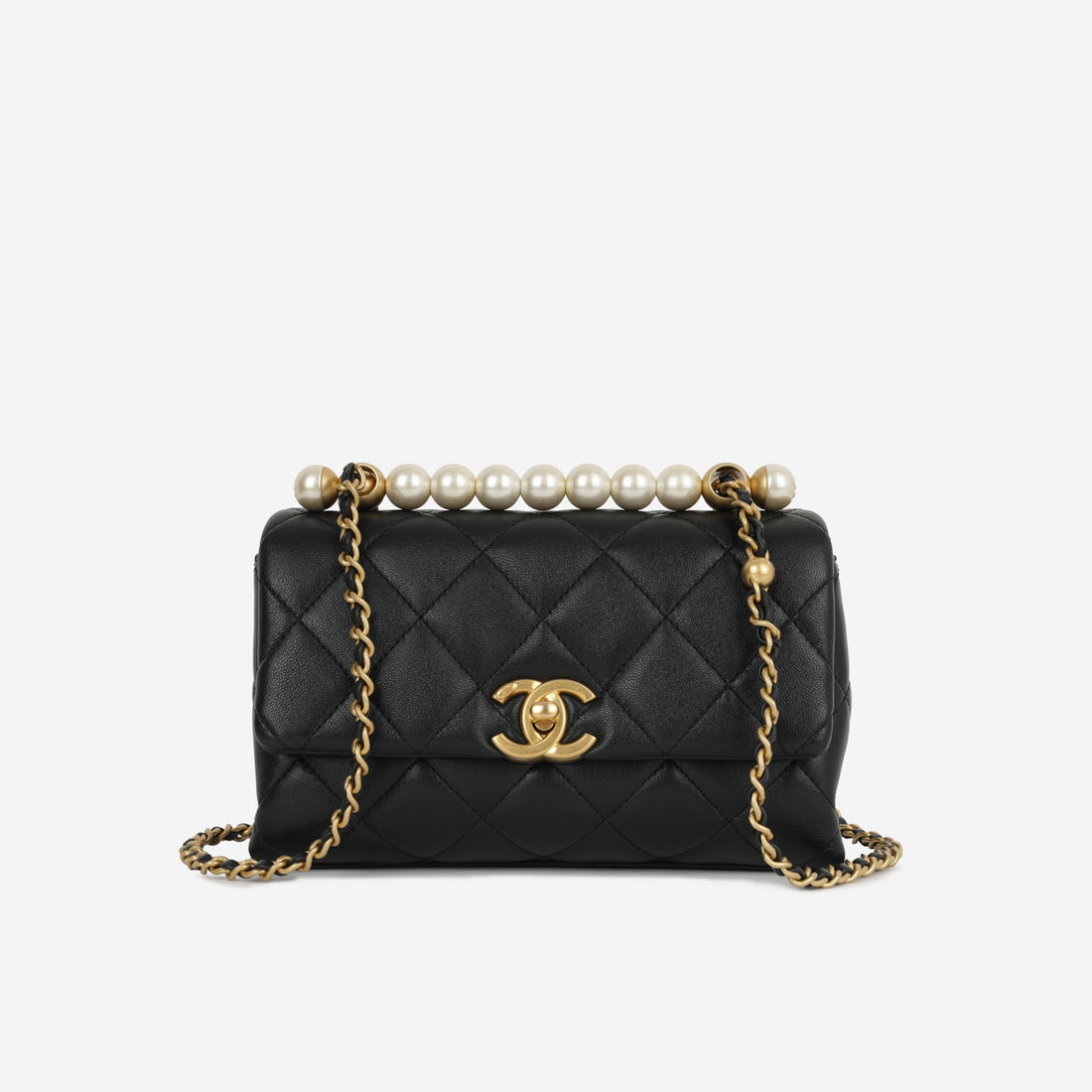 Chanel Mini Rectangular with Pearl Top Handle Black Lambskin Aged Gold Hardware