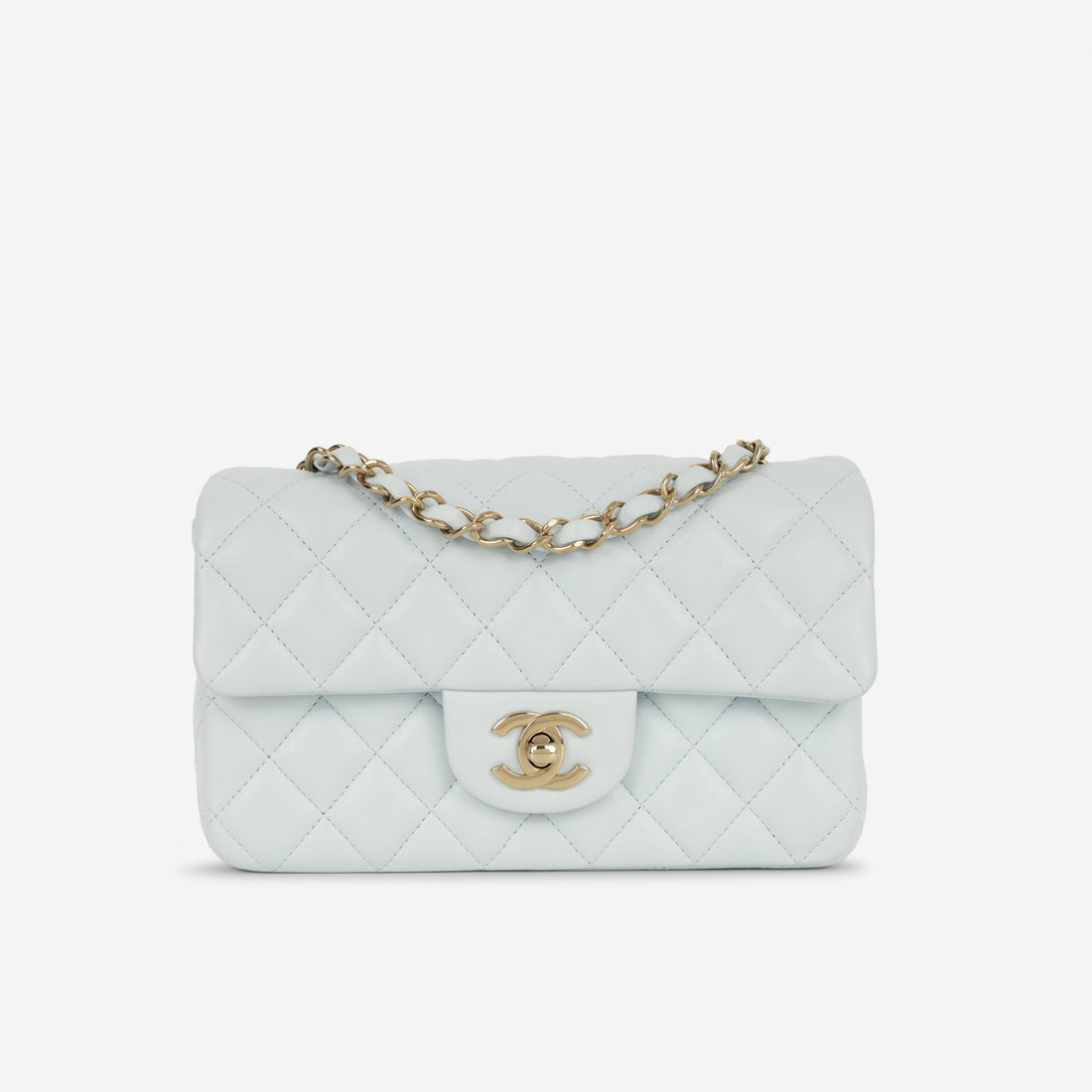 Chanel Mini Rectangular Baby Blue Lambskin Champagne Gold Hardware
