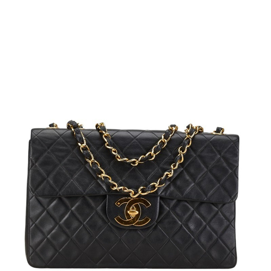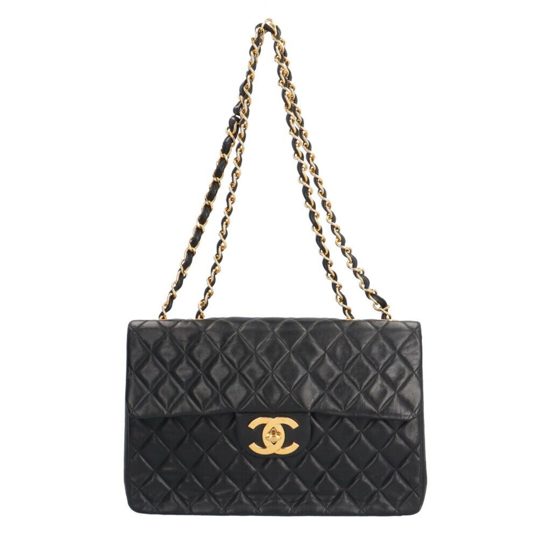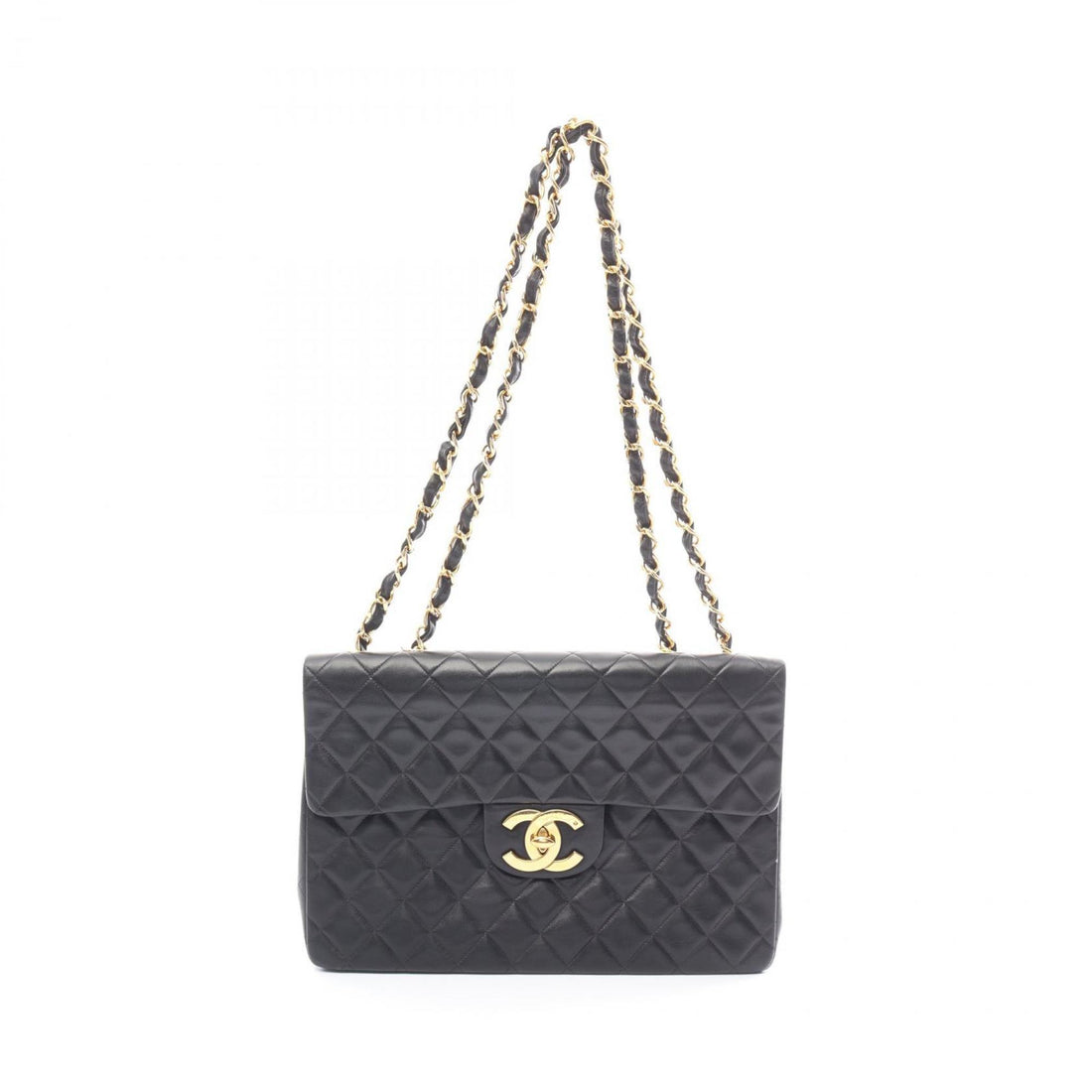 An CHANEL Large Classic Handbag 11"Chain Shoulder Bag New Black Lamb. The color is Black....