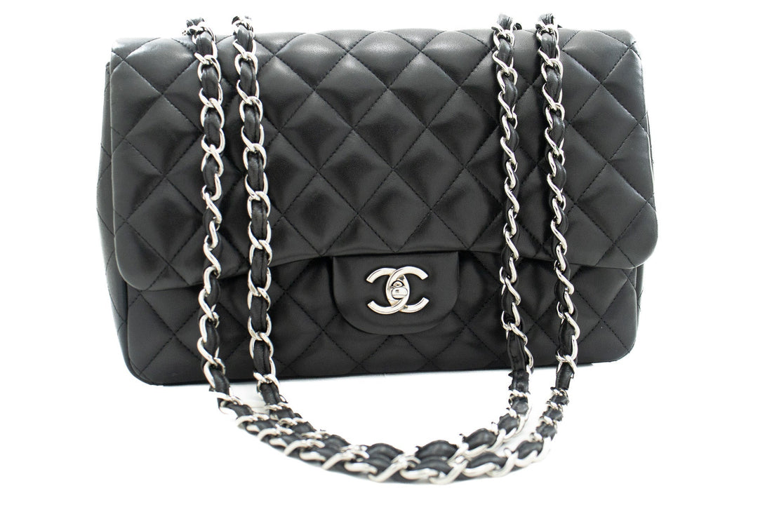 CHANEL Classic Large 11" Chain Shoulder Bag Flap Black Lambskin j42