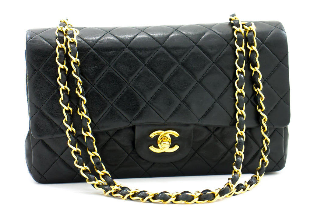 CHANEL Classic Double Flap 10" Chain Shoulder Bag Black Lambskin i65
