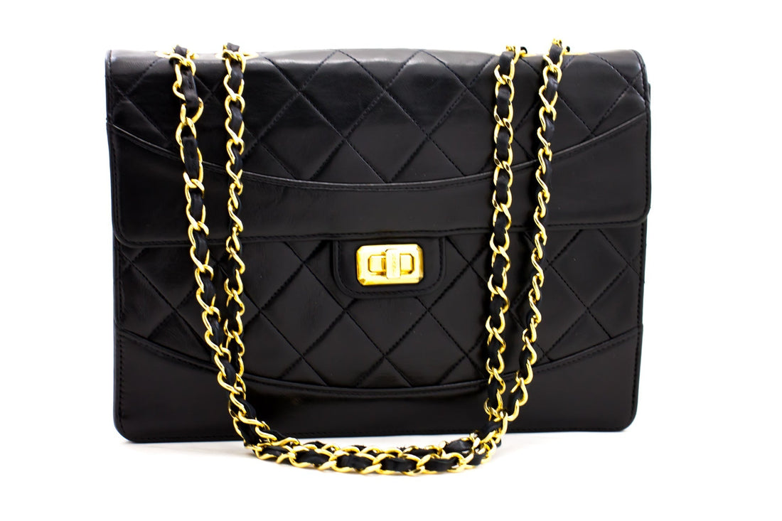 An authentic CHANEL Jumbo 13" Maxi 2.55 Flap Chain Shoulder Bag Black made of black...