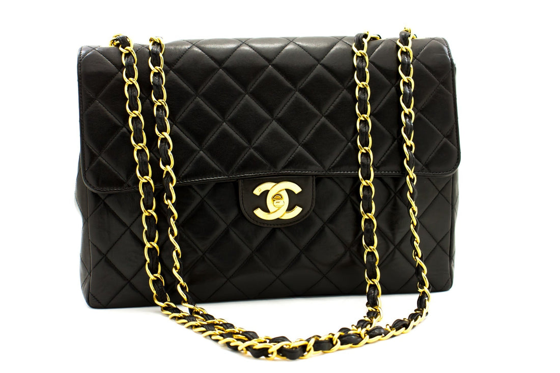 CHANEL Jumbo 11" Large Chain Shoulder Bag Flap Black Lambskin Gold f98