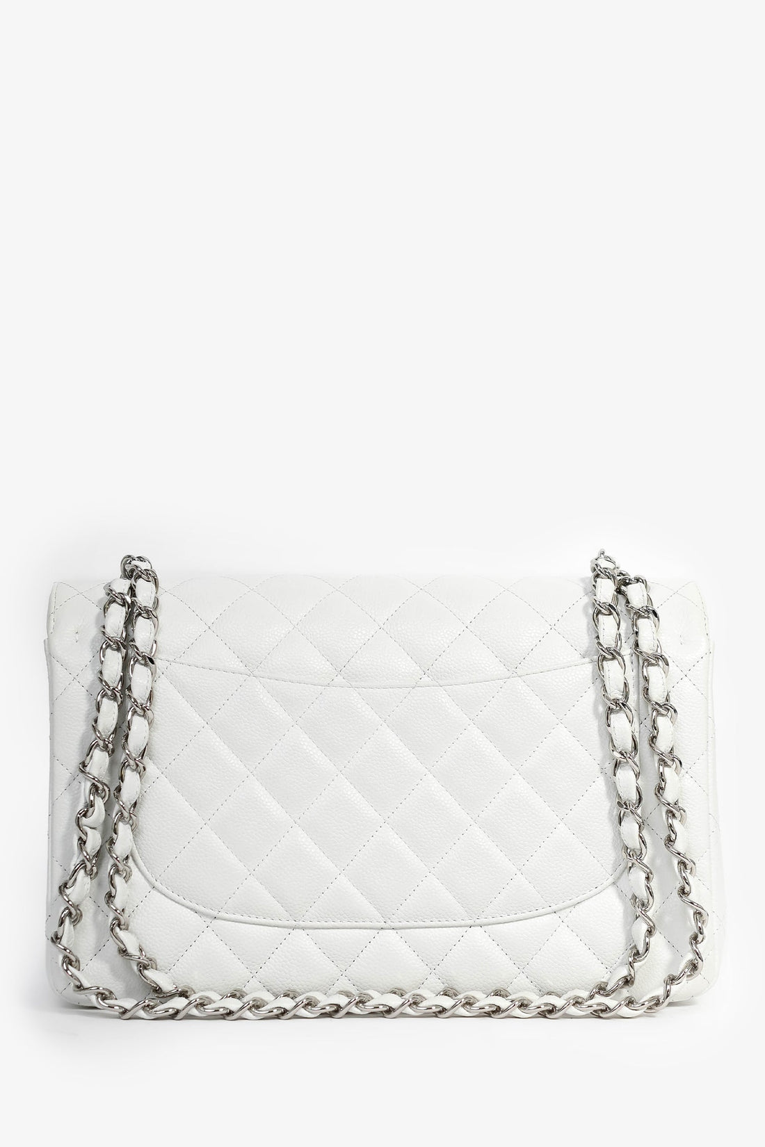 Pre-Loved Chanel™ 2011 White Caviar Leather Jumbo Double Flap Shoulder Bag. Silver-toned hardware. Tonal interior....