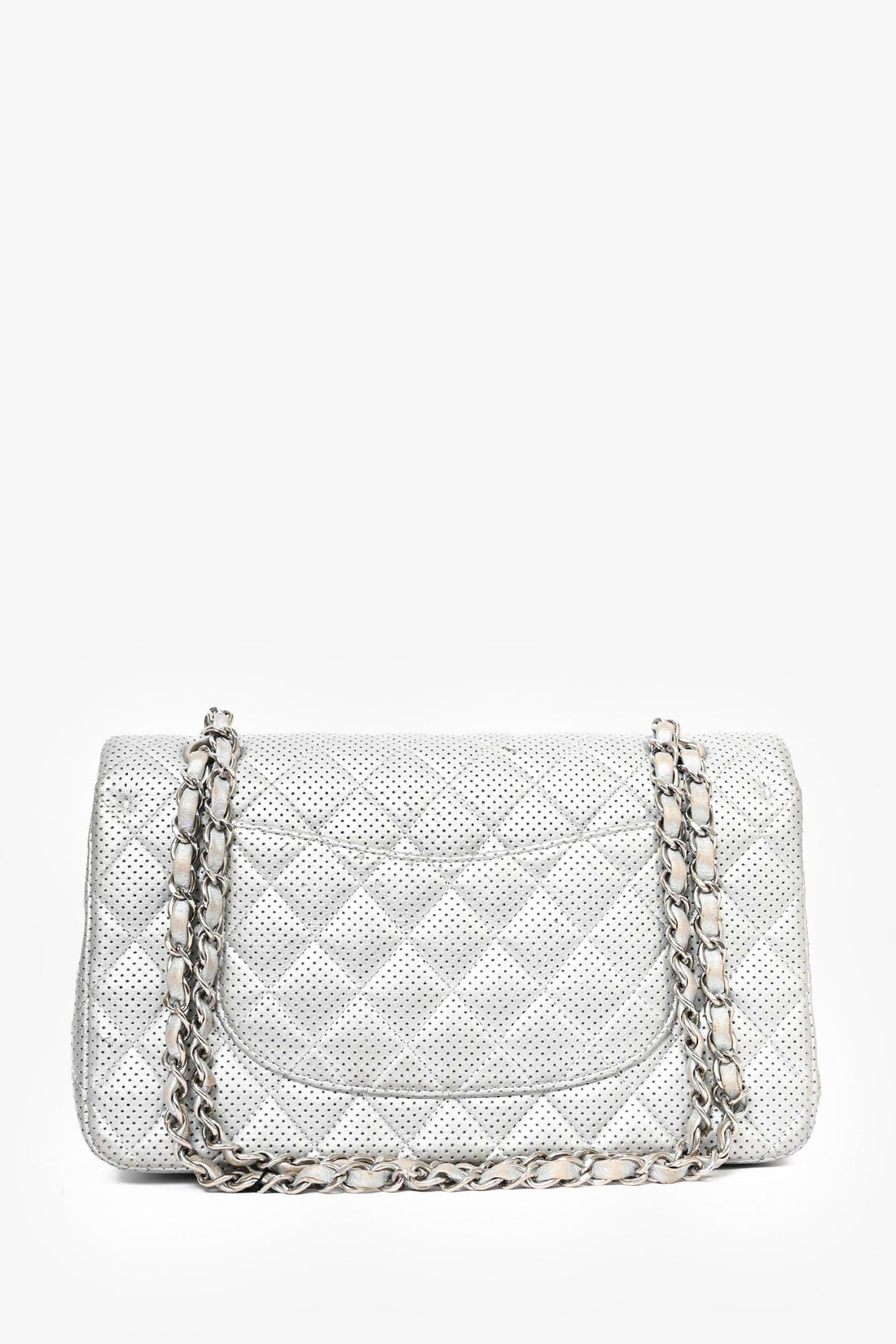 Pre-Loved Chanel™ 2014 Silver Perforated Leather Medium Double Flap Shoulder Bag. Front fold-over flap with...