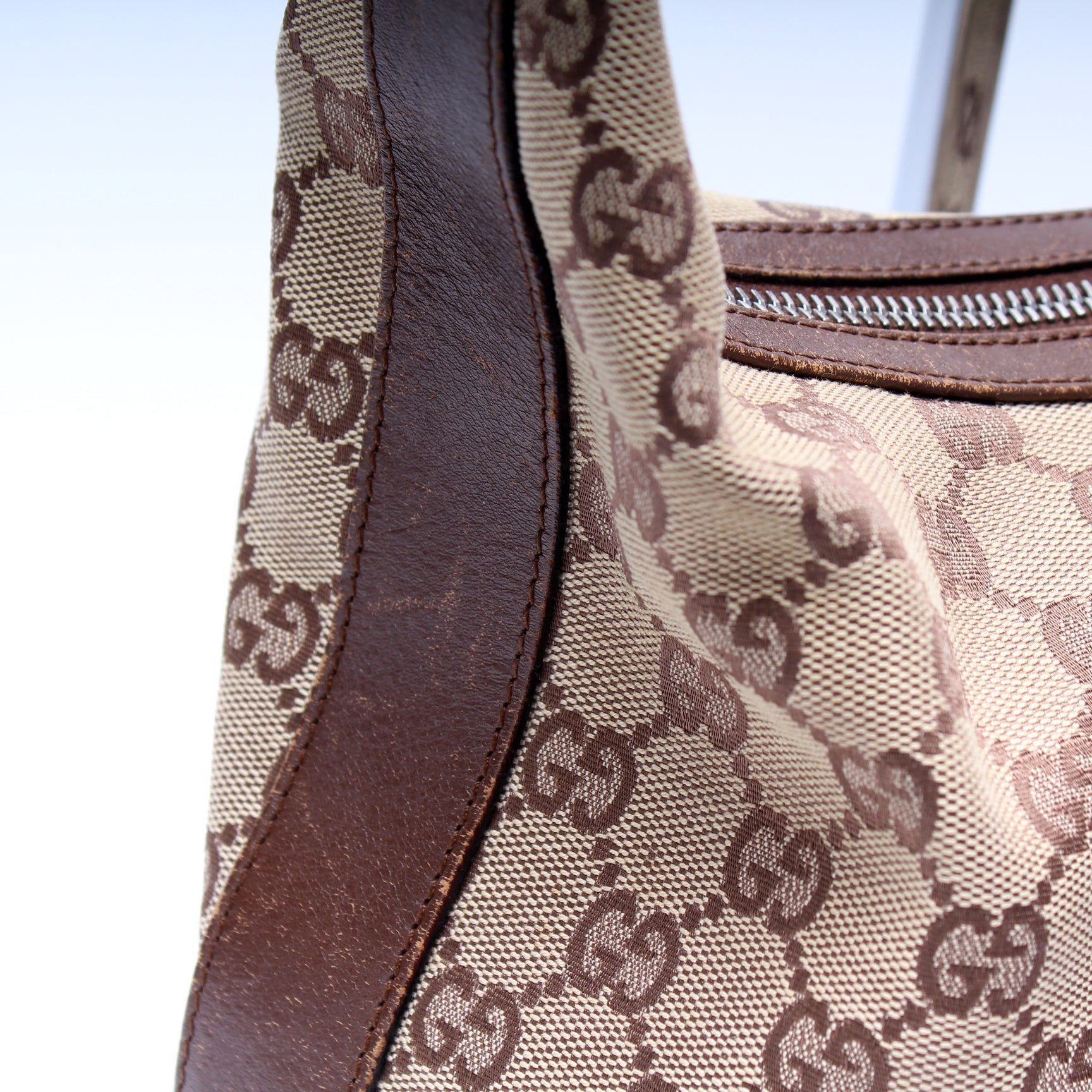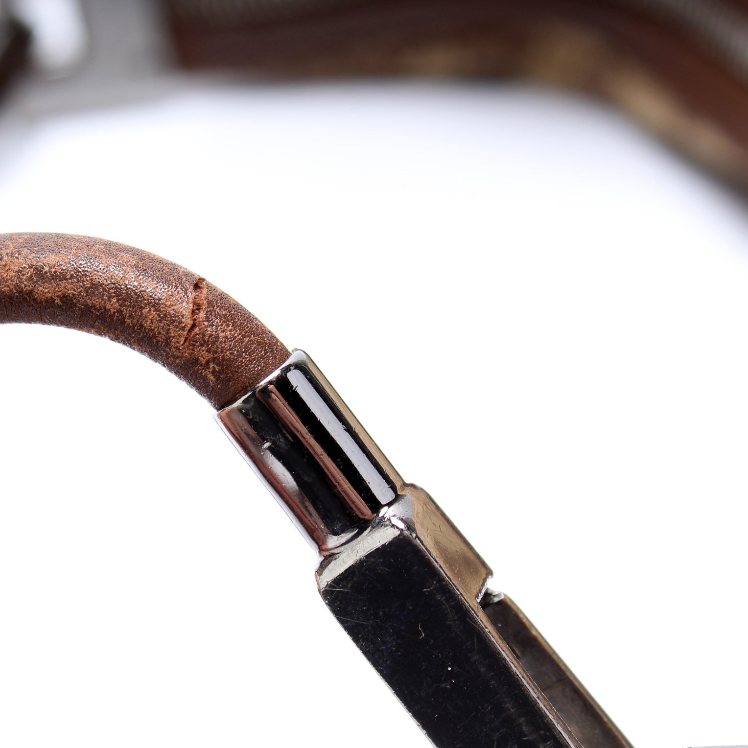 Strap: The shoulder strap shows heavy wear and light cracking throughout.