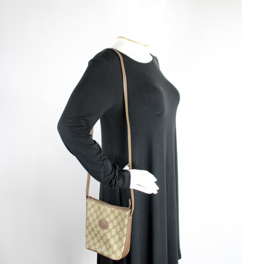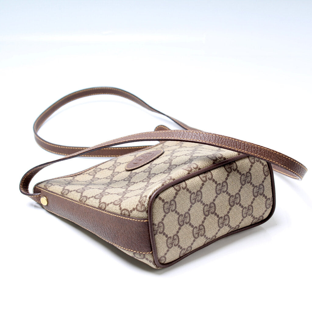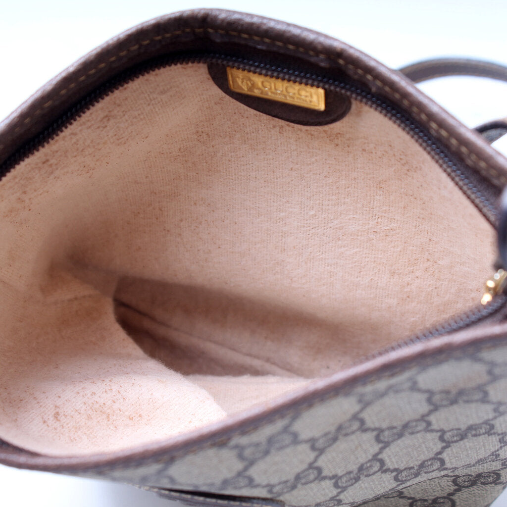 This Gucci Mini Bucket Crossbodyis eye catching bag. The exterior is in the classic GG Supreme Canvas.