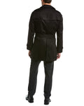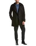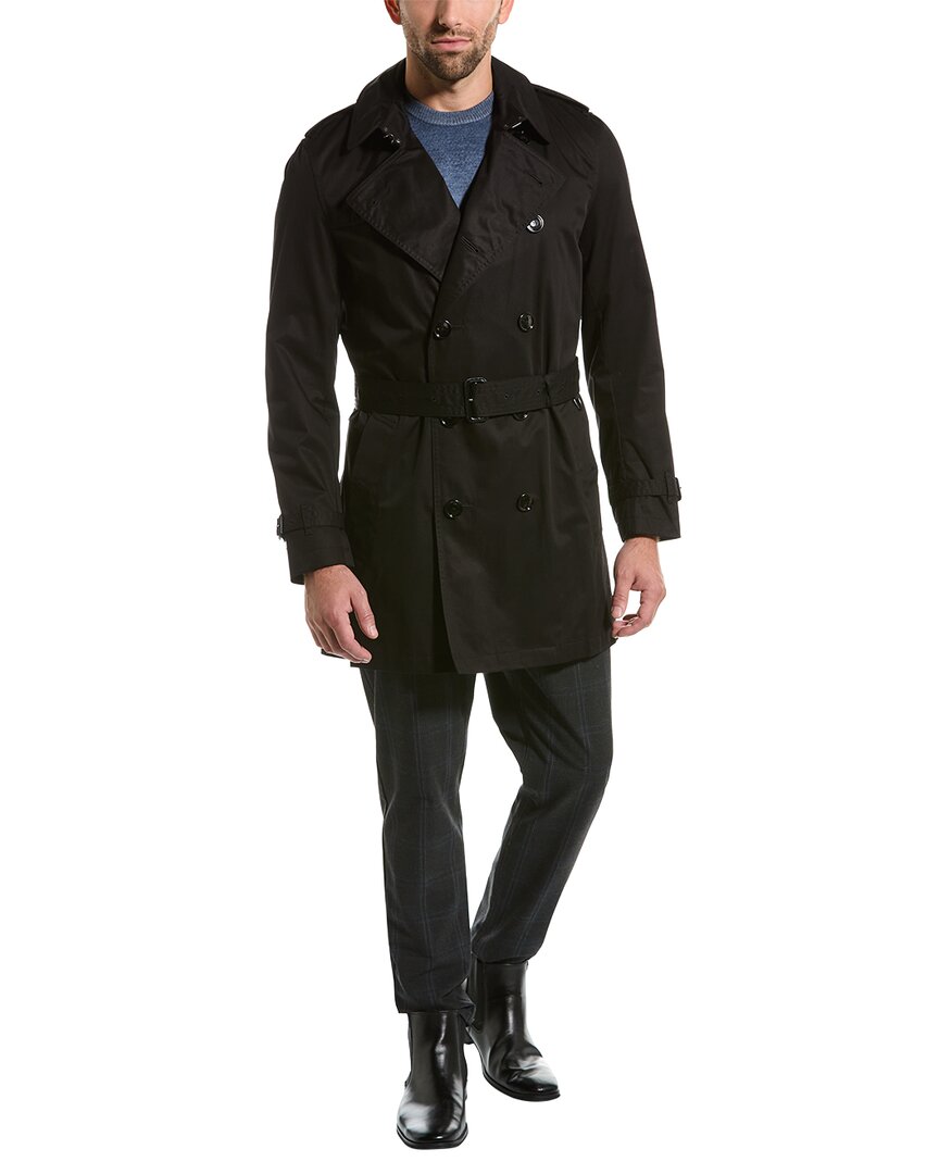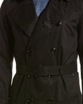 - Britton Coat In Black With Spread Collar, Storm Flap Accents, Strap Accents At Shoulders And Cuffs, Belted Waist, Two Front Pockets And Center Vent At Back Hem