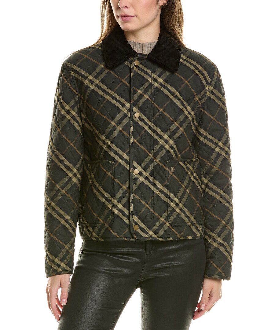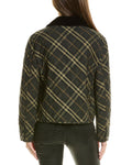 - Cropped Check Quilted Barn Jacket In Shadow Plaid With Corduroy Collar, Two Front Pockets, Snap Cuffs, And Snap Vents At Sides