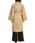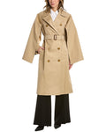 - Gabardine Trench Coat In Beige With Cape Sleeves, Belted Waist, Side Slip Pockets, And Buckle Straps At Cuffs