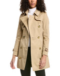 - The Chelsea Trench Coat In Honey With Epaulette Details, Two Front Pockets, Buckle Straps At Cuffs, Belted Waist, And Vented Back