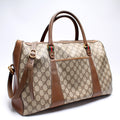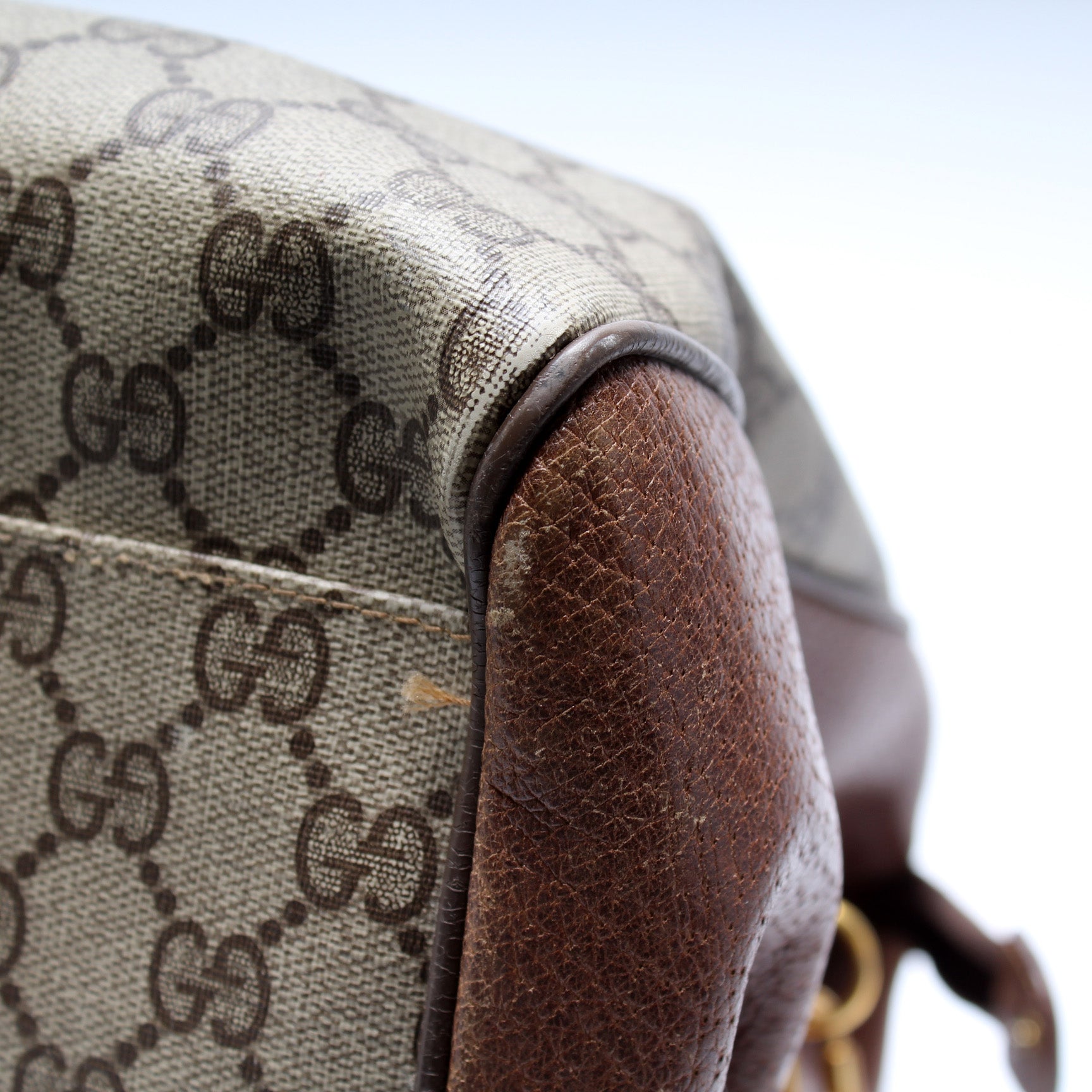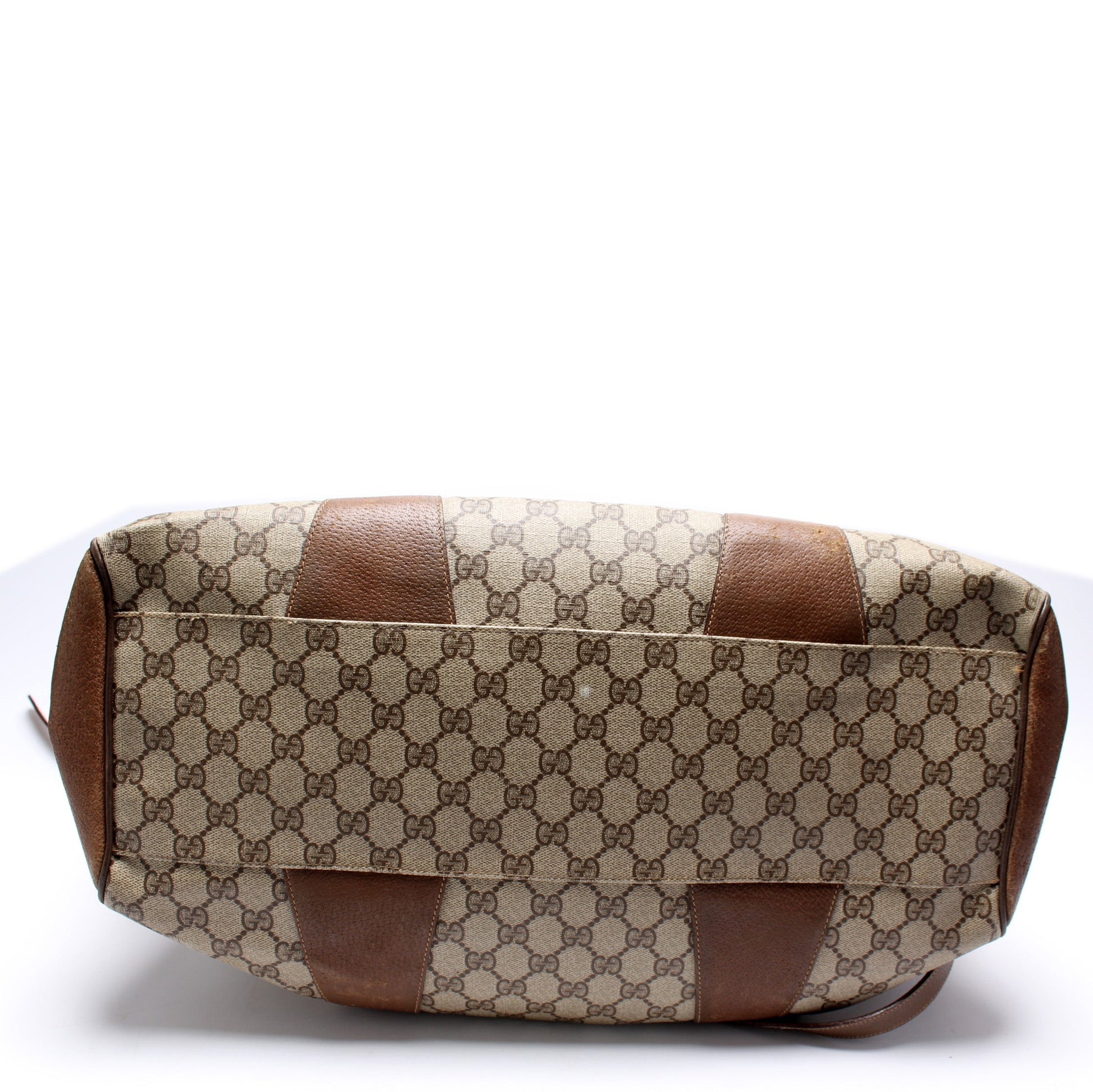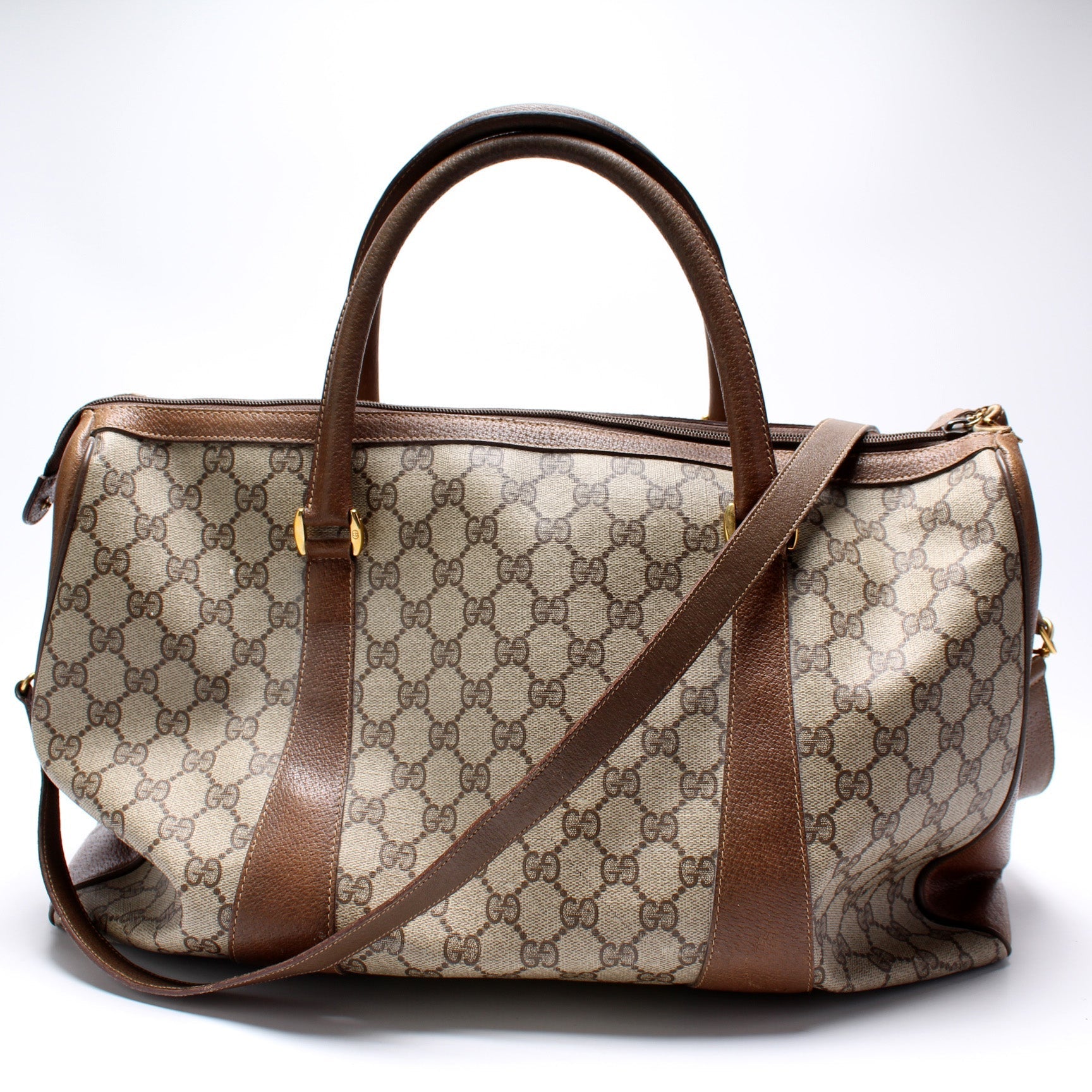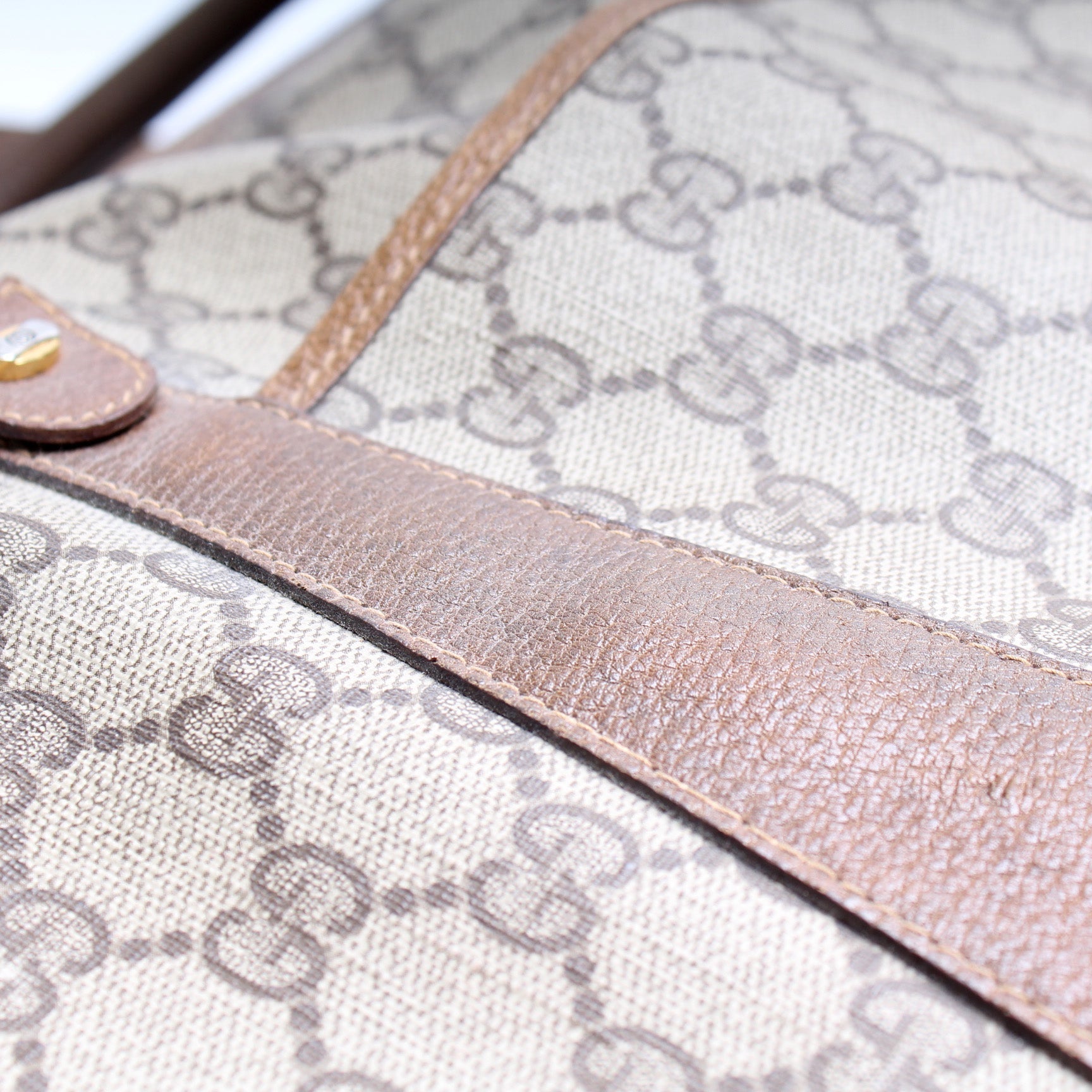 This Gucci GG Supreme Duffle Bag With Strap Vintageis eye catching bag. The exterior is in the classic Gucci GG Supreme coated canvas.