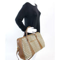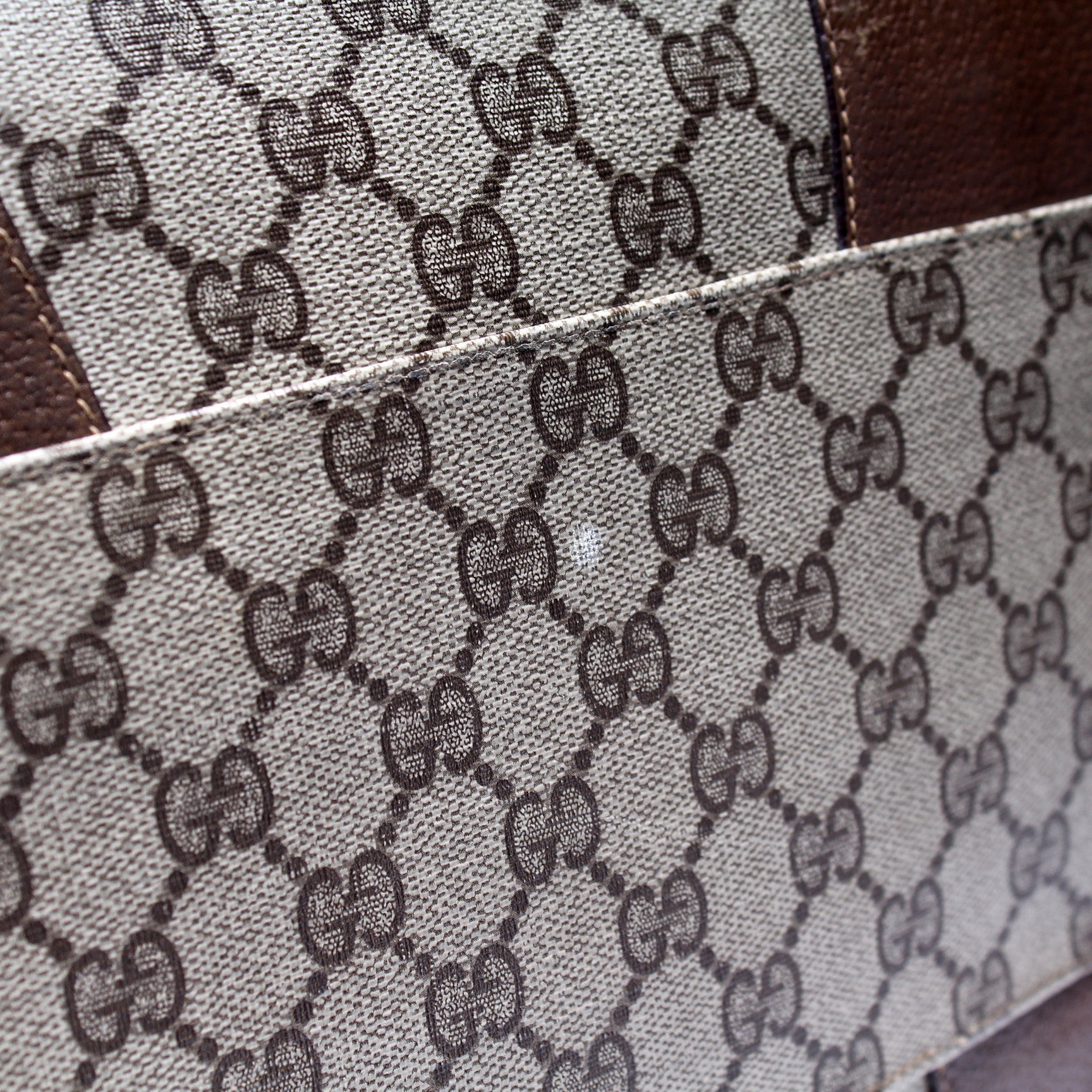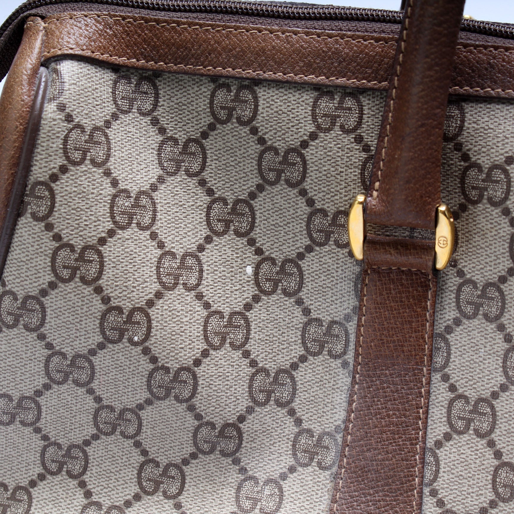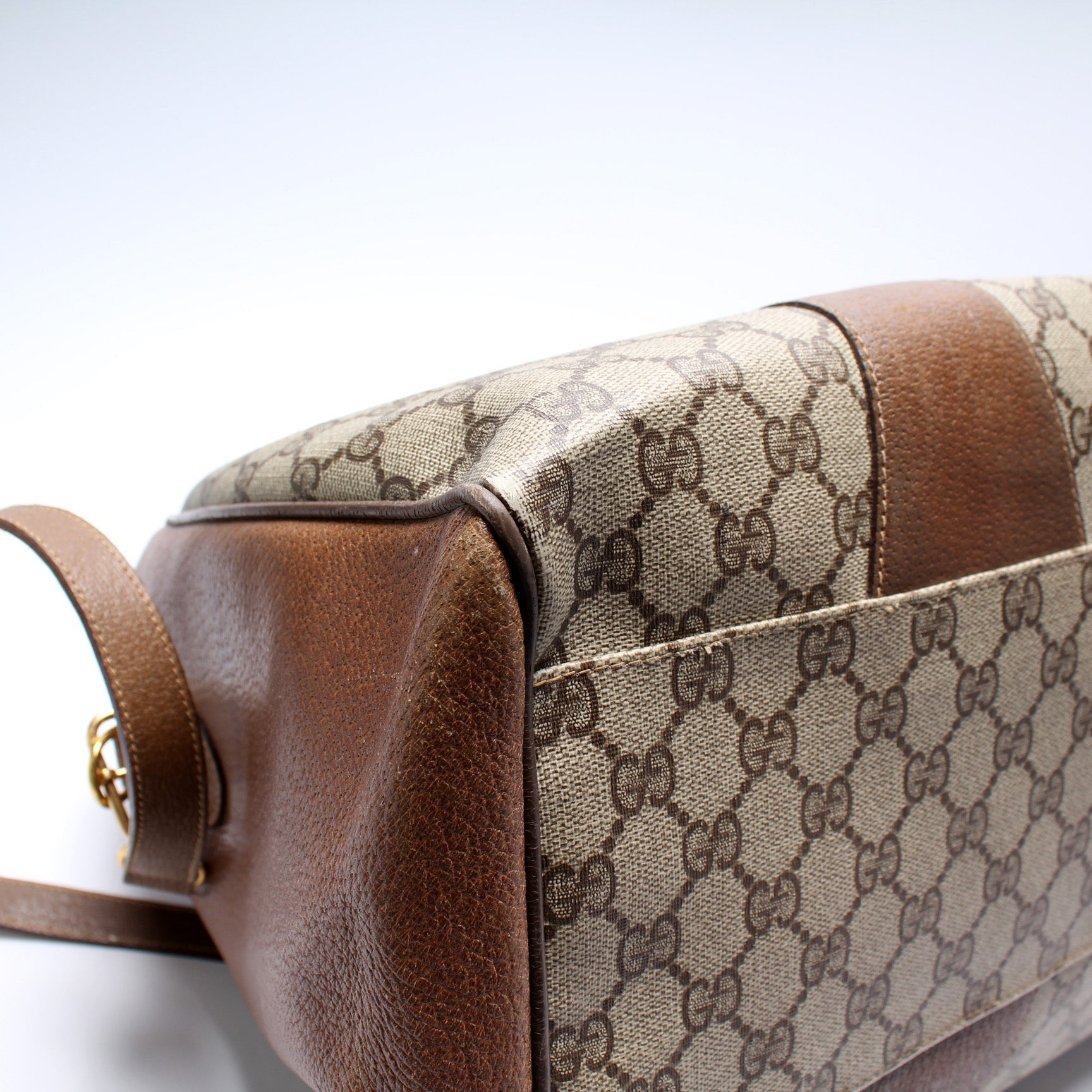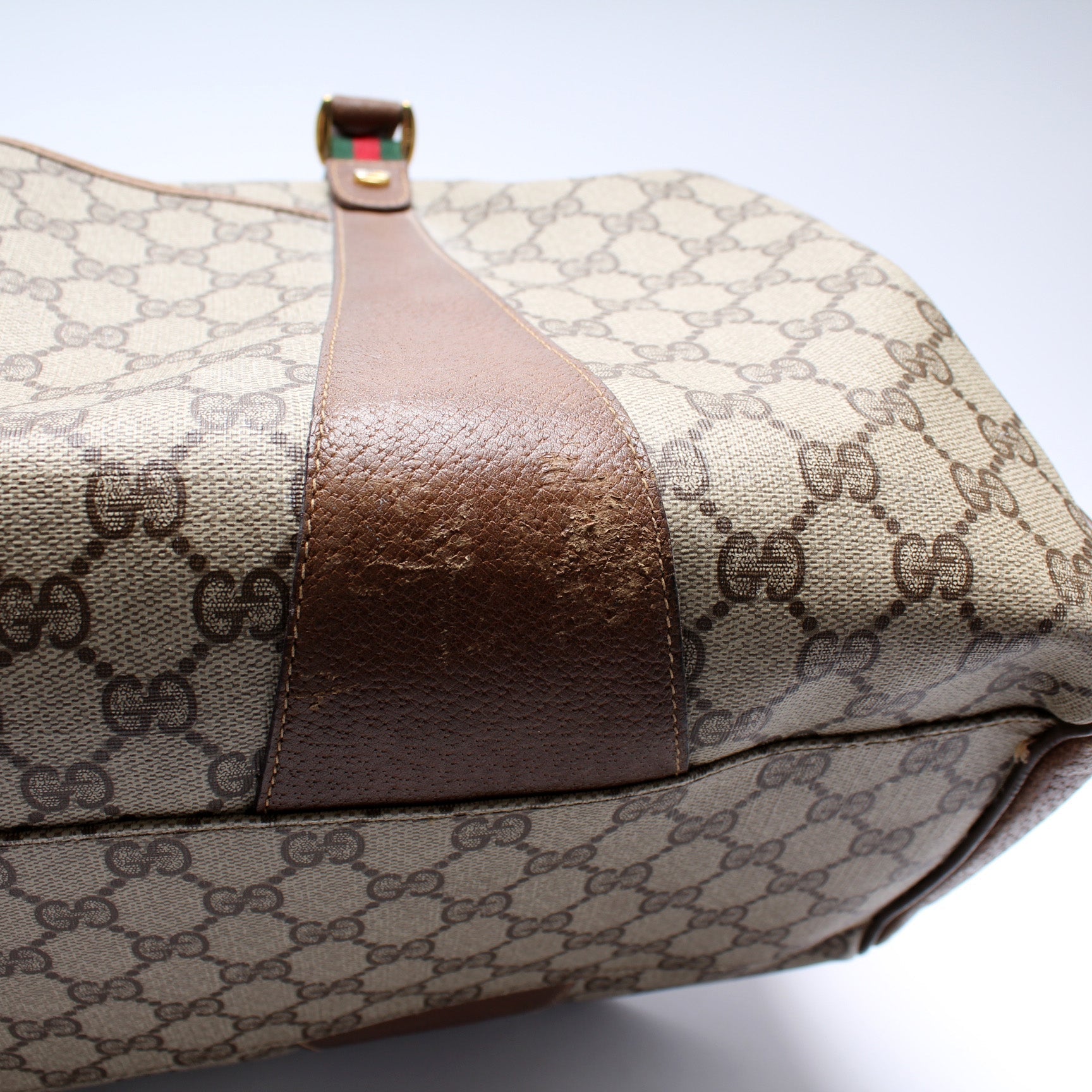 This Gucci GG Supreme Duffle Bag With Strap Vintageis eye catching bag. The exterior is in the classic Gucci GG Supreme coated canvas.