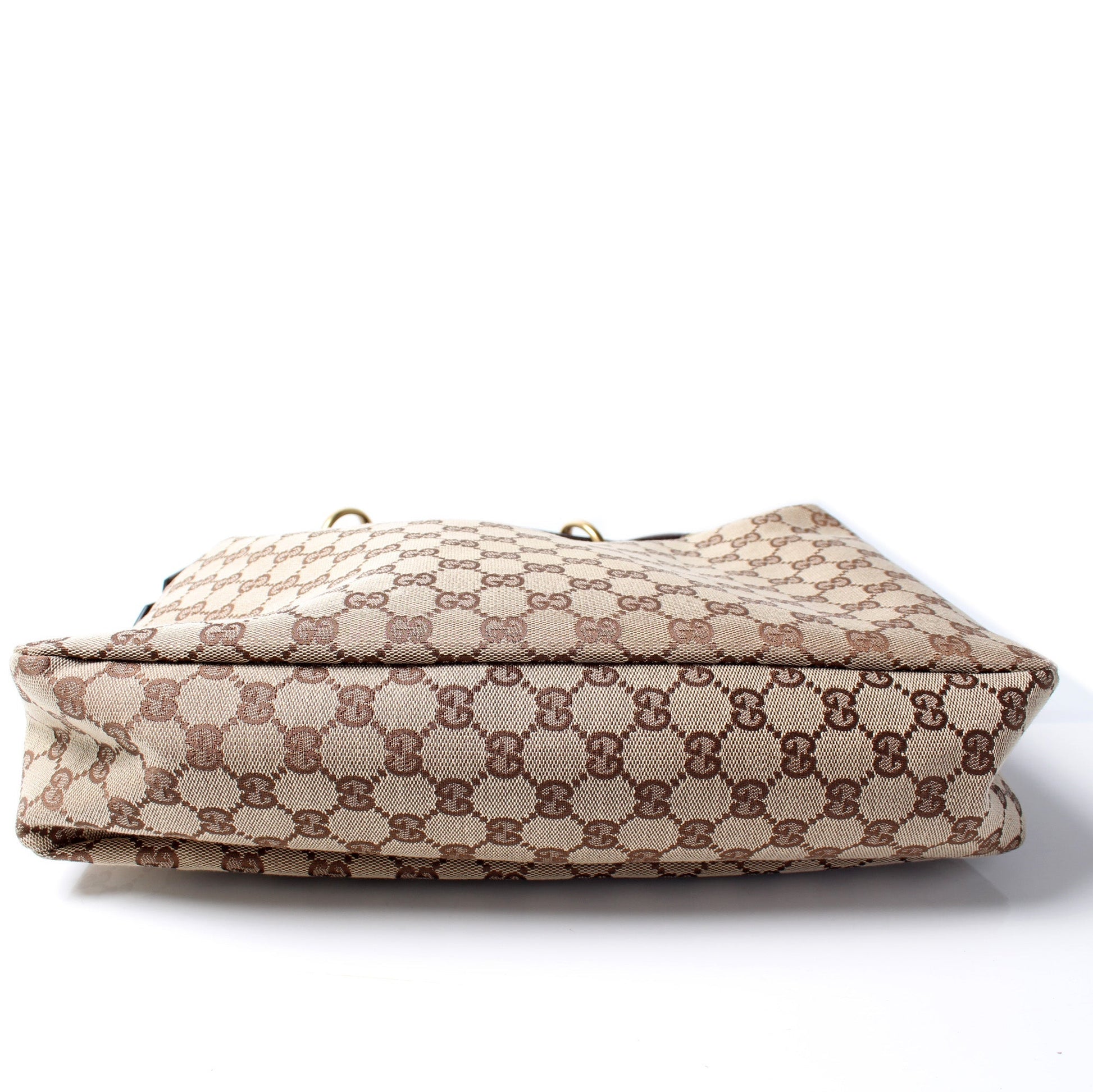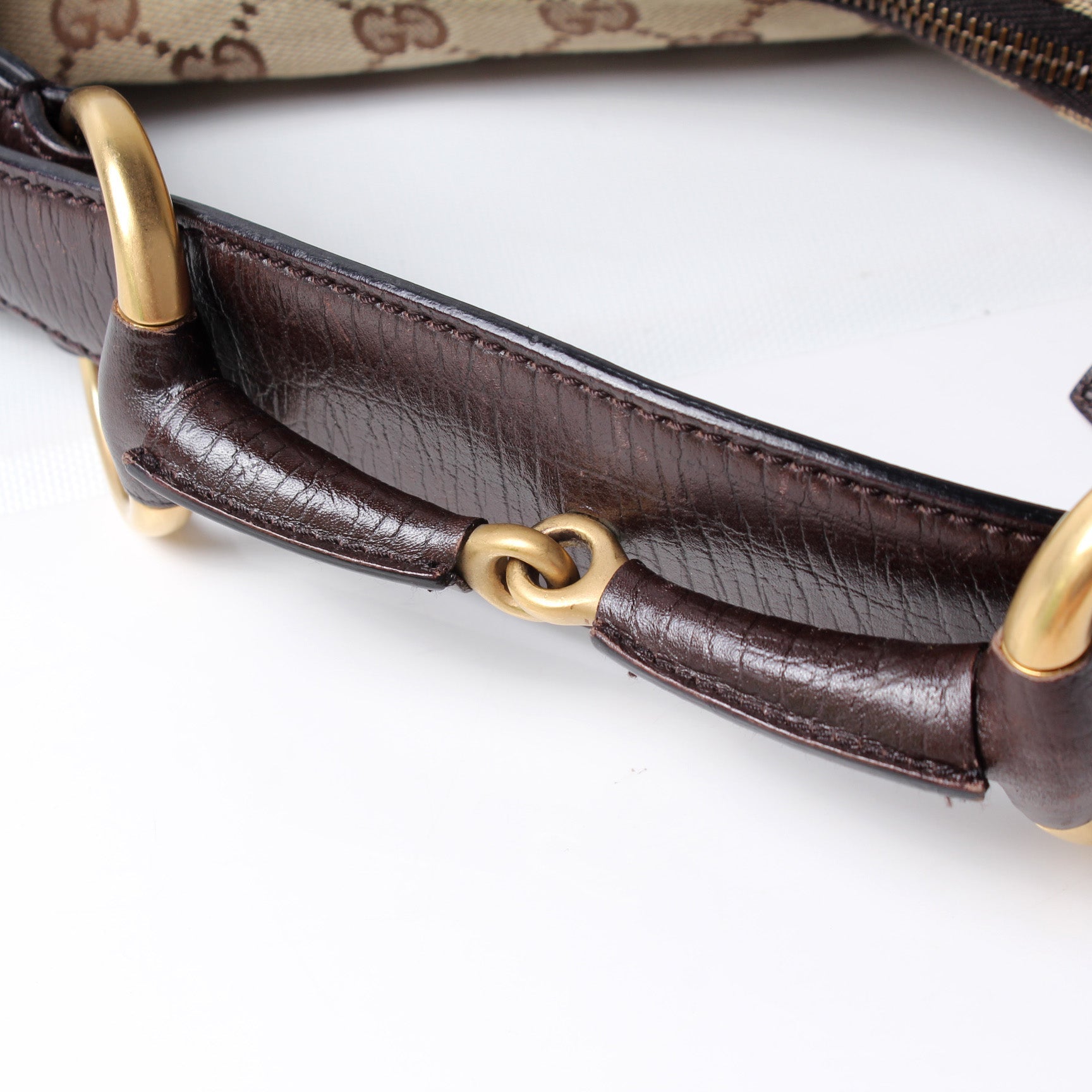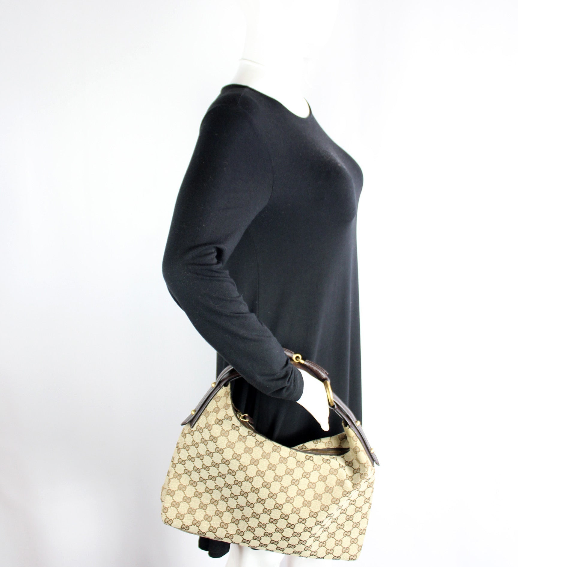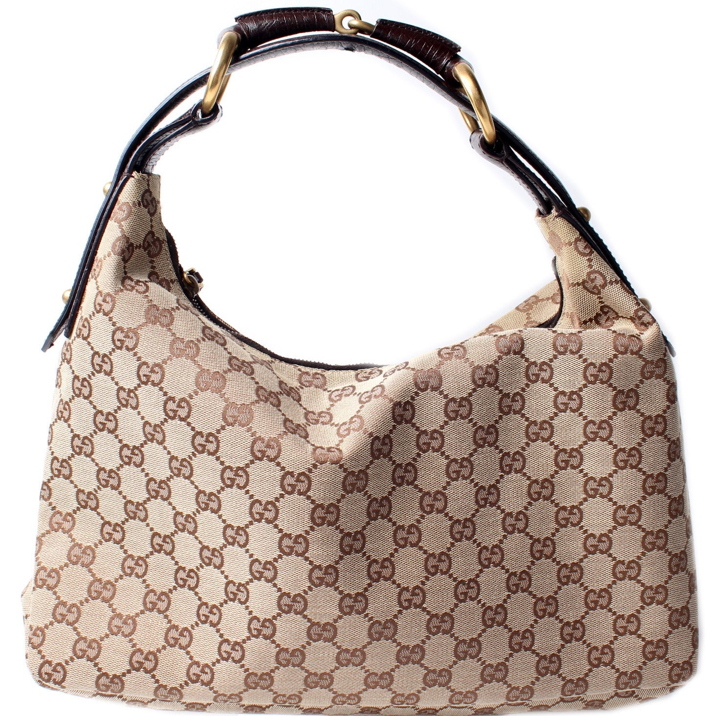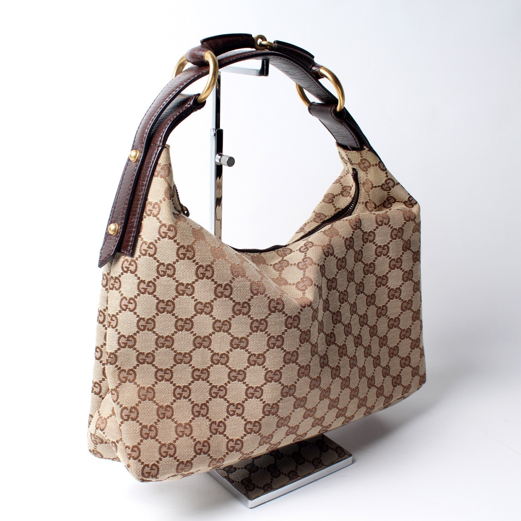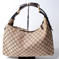 This Gucci Horsebit Hobois eye catching bag. The exterior is in the classic GG canvas.