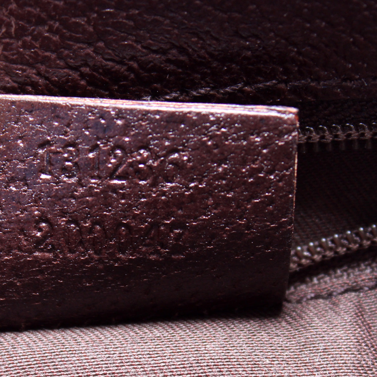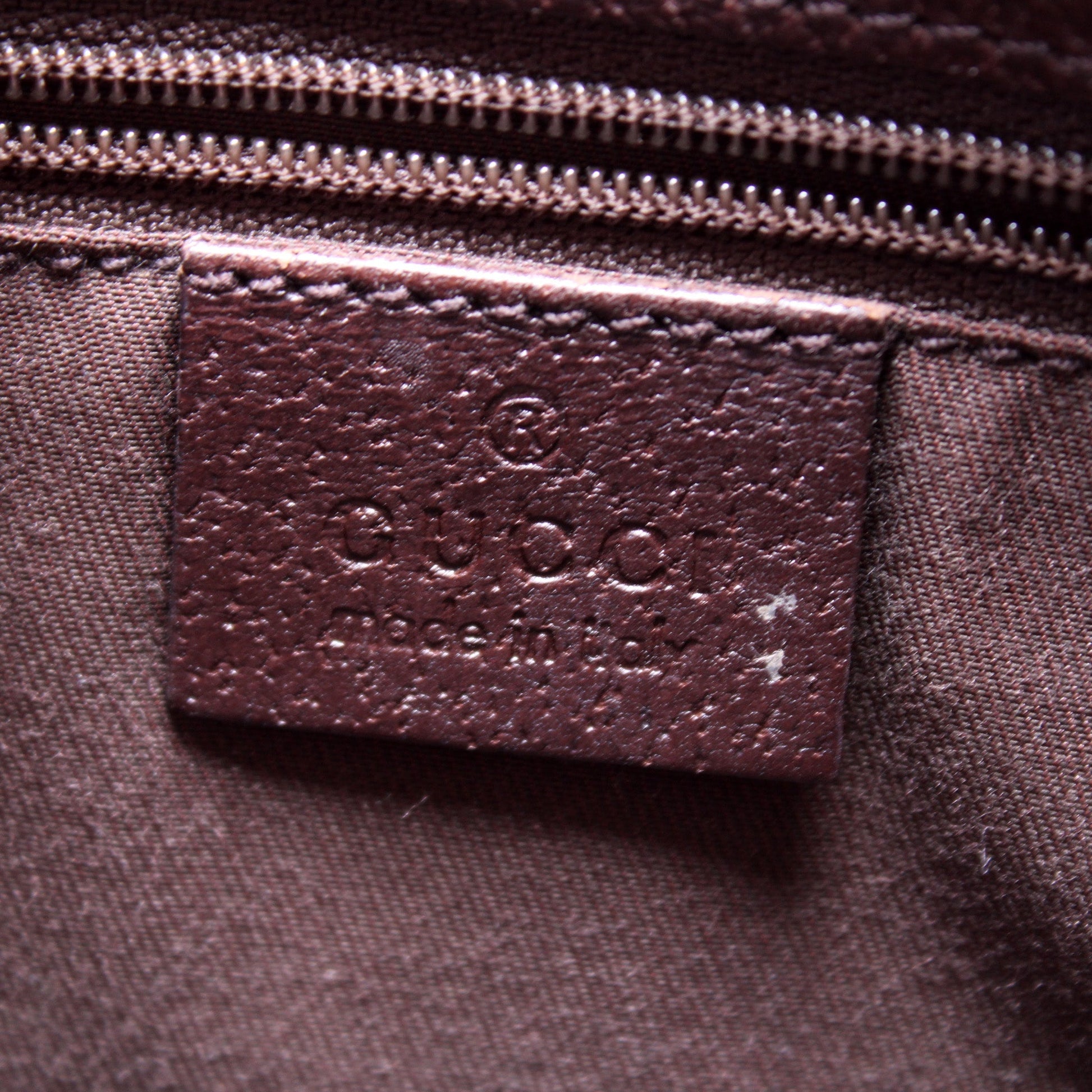 Interior: The interior is clean and features one zipper pocket. The Gucci leather tab shows minor scuffs. The leather flap shows minor impressions due to storage and wear.
