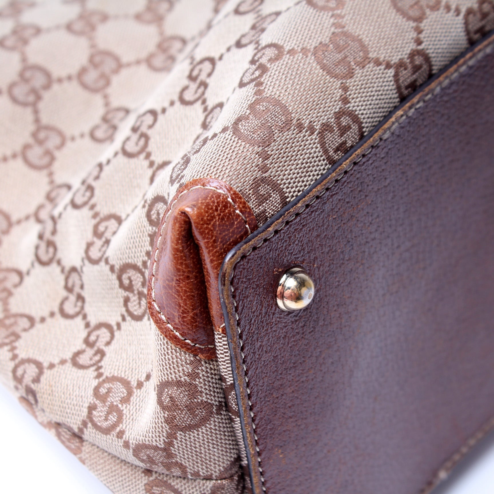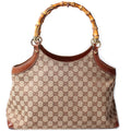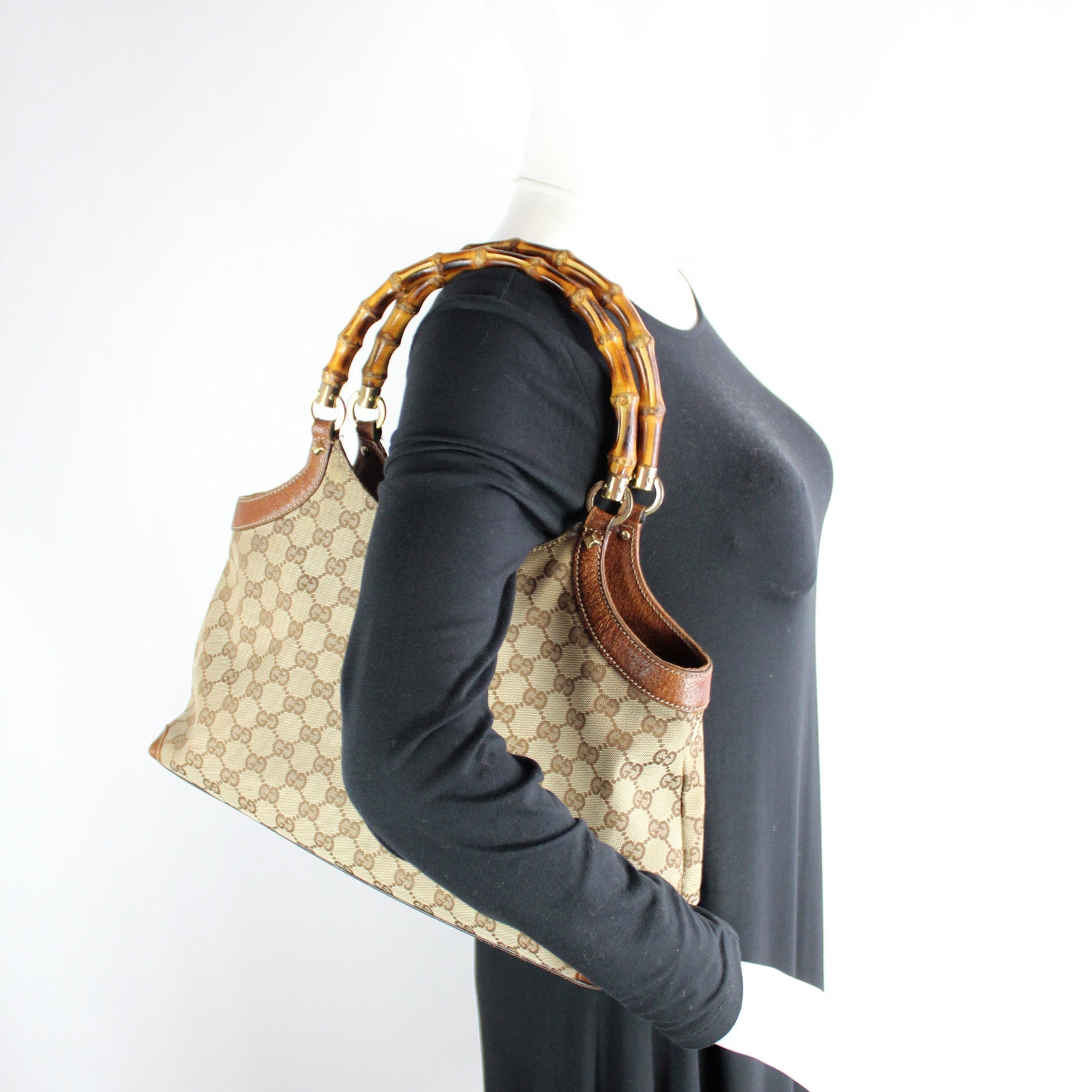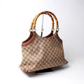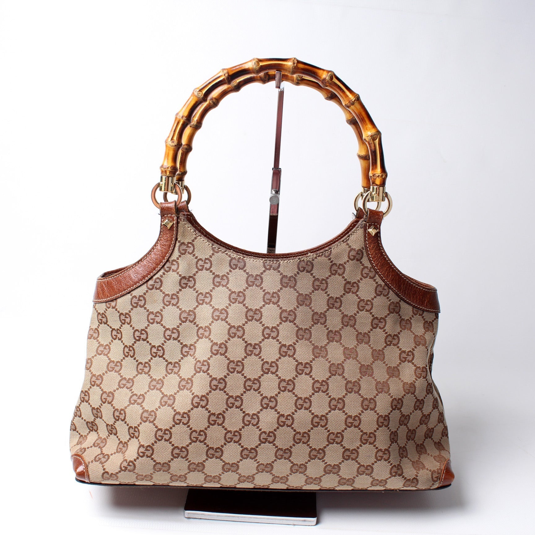 This Gucci Bamboo Handle Tote is guaranteed 100% authentic. The exterior is in the classic Gucci GG canvas.
