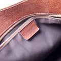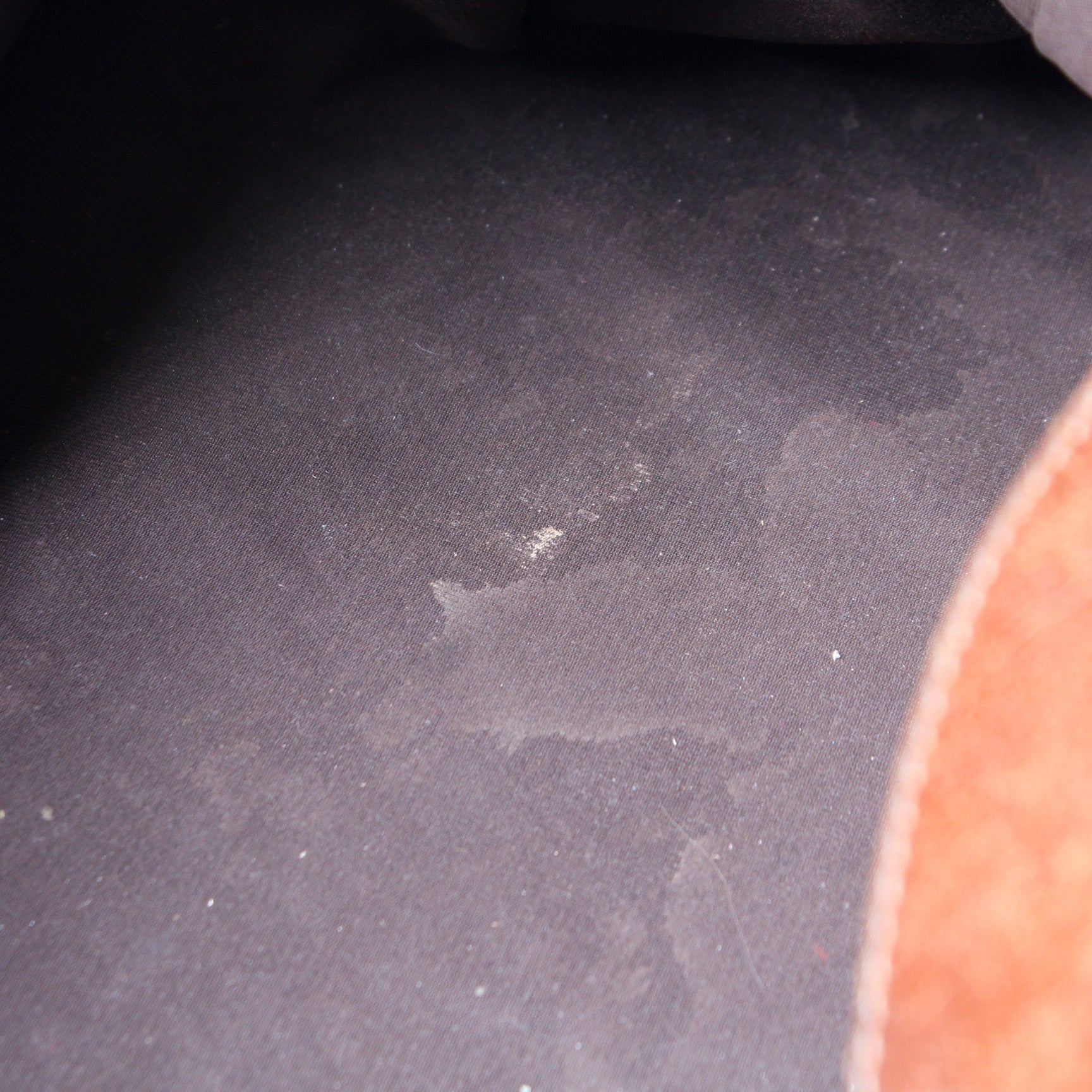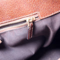 Interior: The interior shows wear and discoloration. The interior features one open pocket and one zip closure pocket.