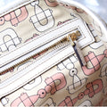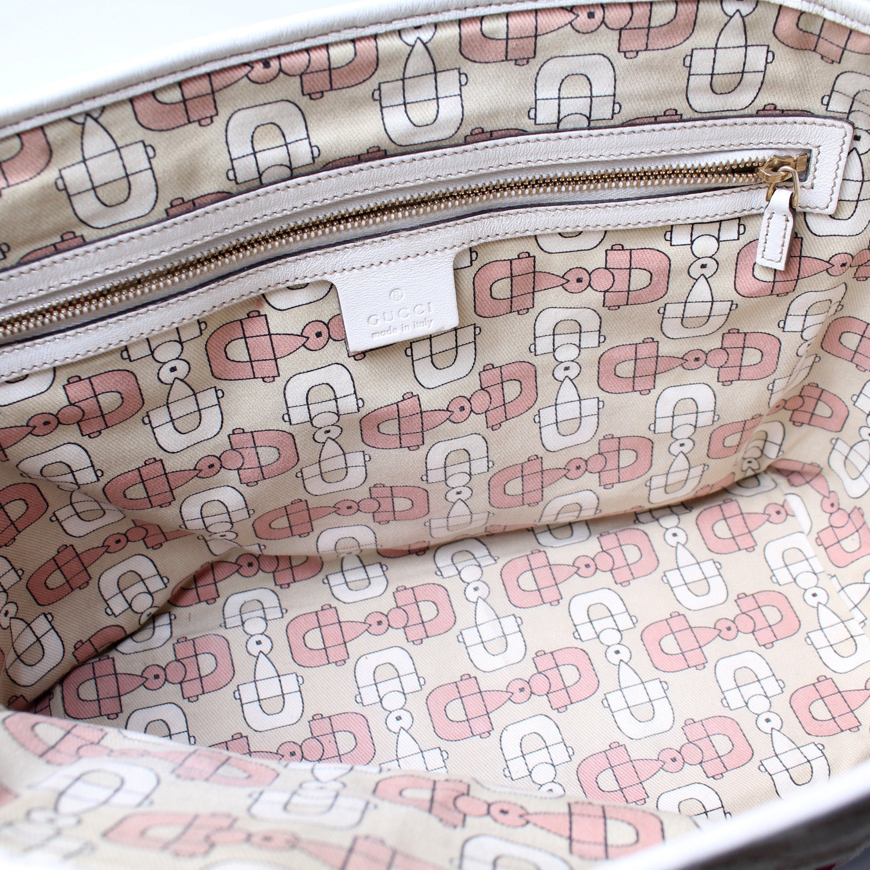 Interior: The interior has minor staining and is free of rips or tears. It features one slip pocket and one zip closure pocket.