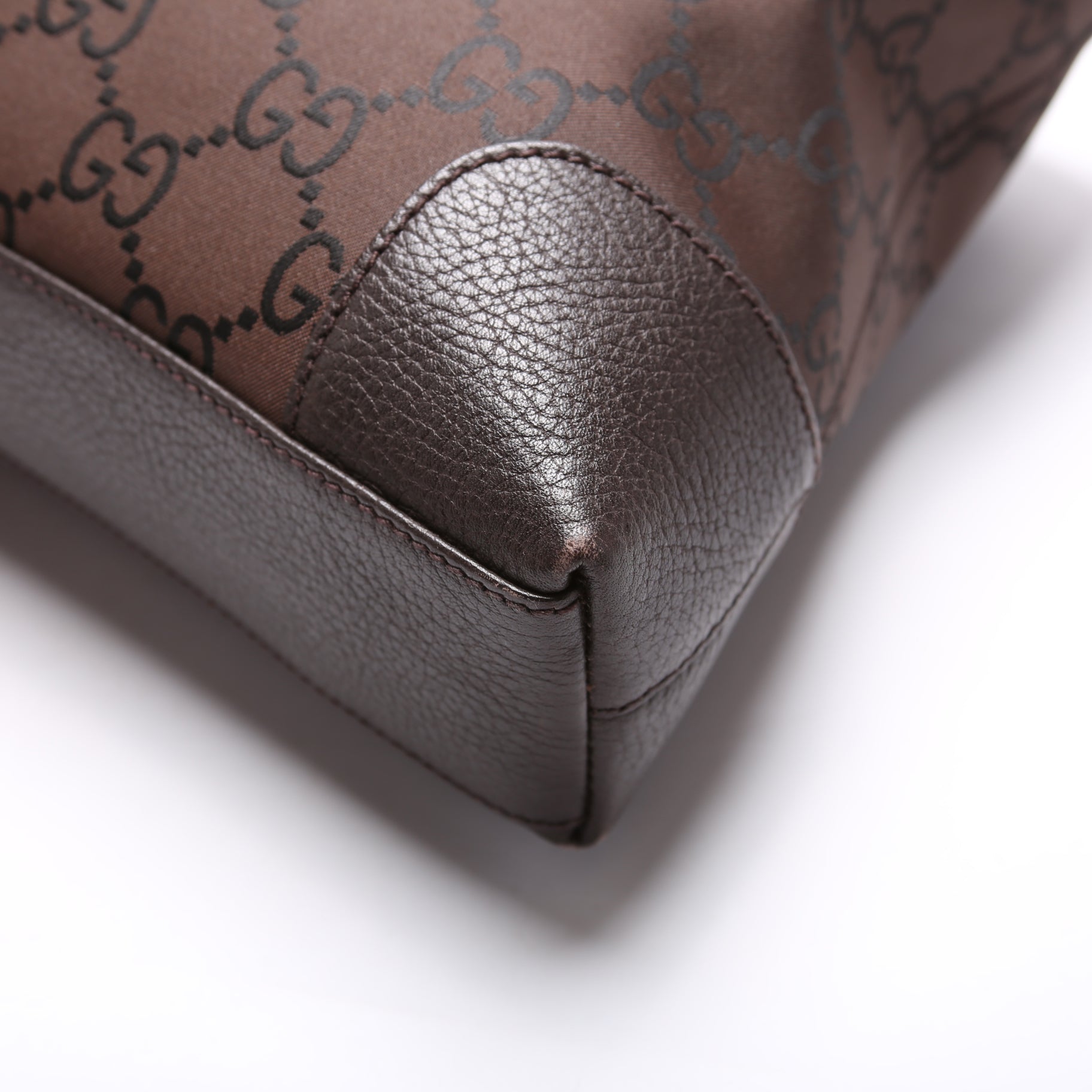 Exterior: The exterior GG nylon shows no major signs of wear. The corners and edges show minor rubbing.