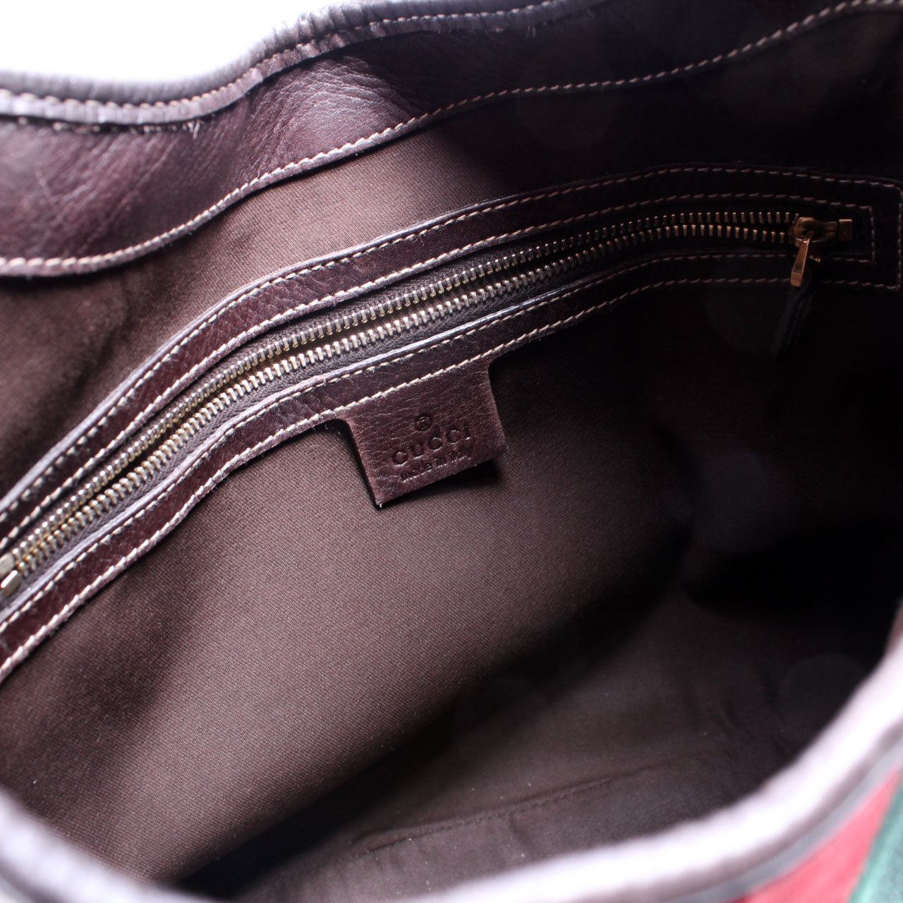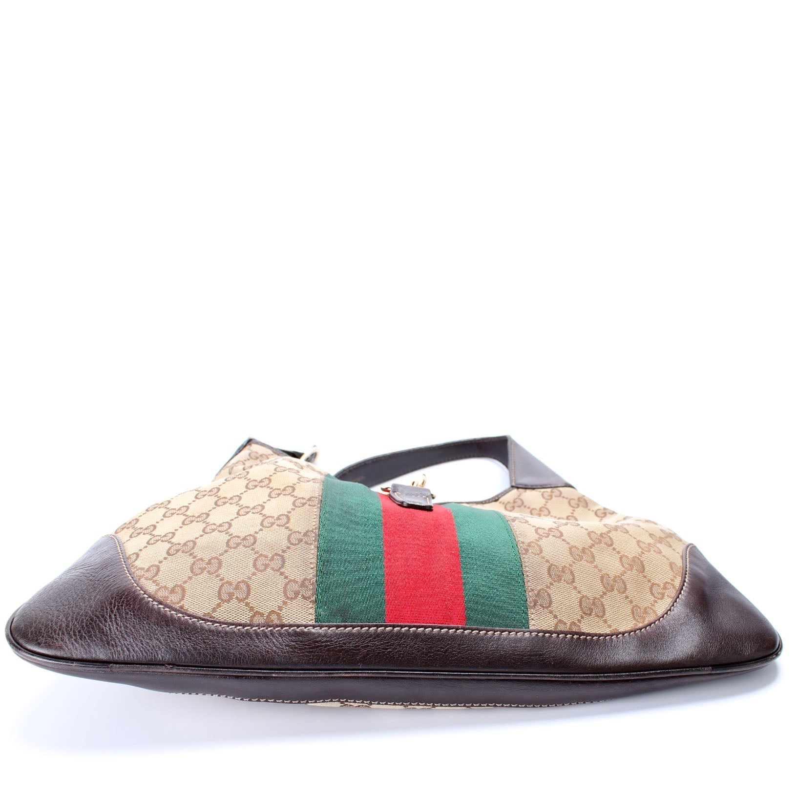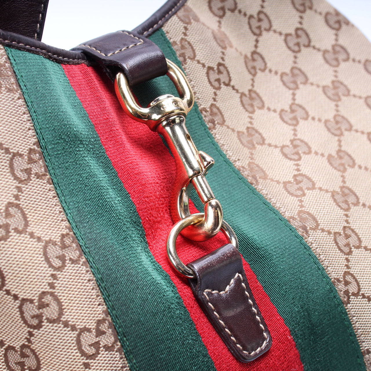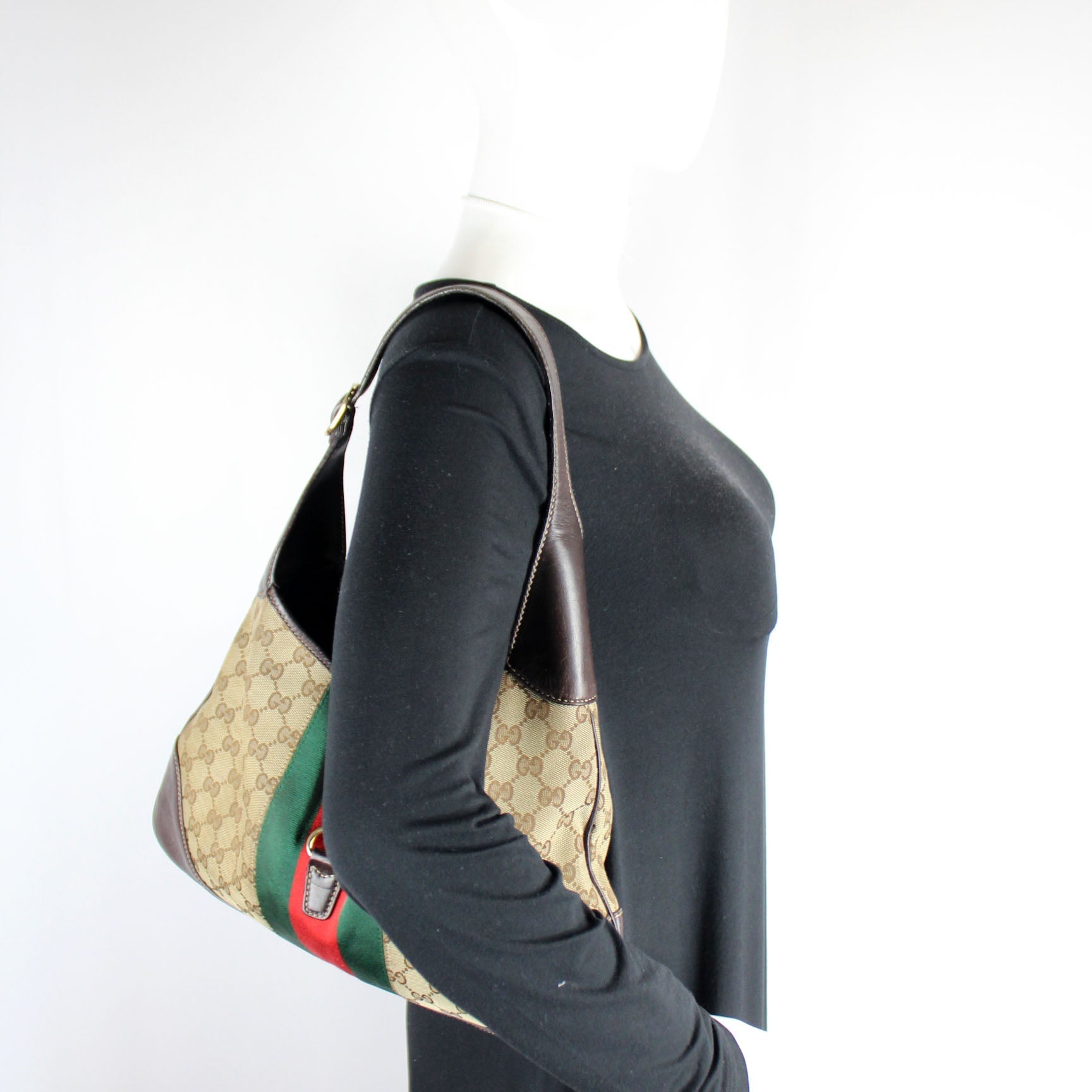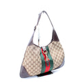 This Gucci Web Jackie Hobois eye catching bag. The exterior is in the classic Gucci GG canvas.