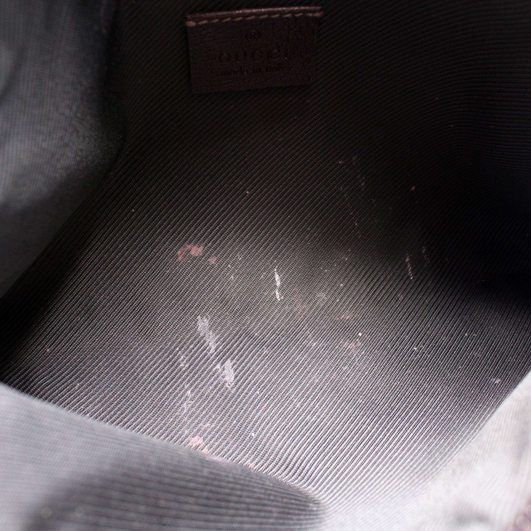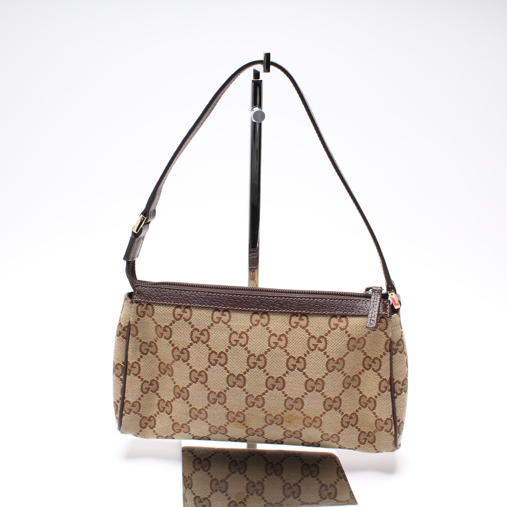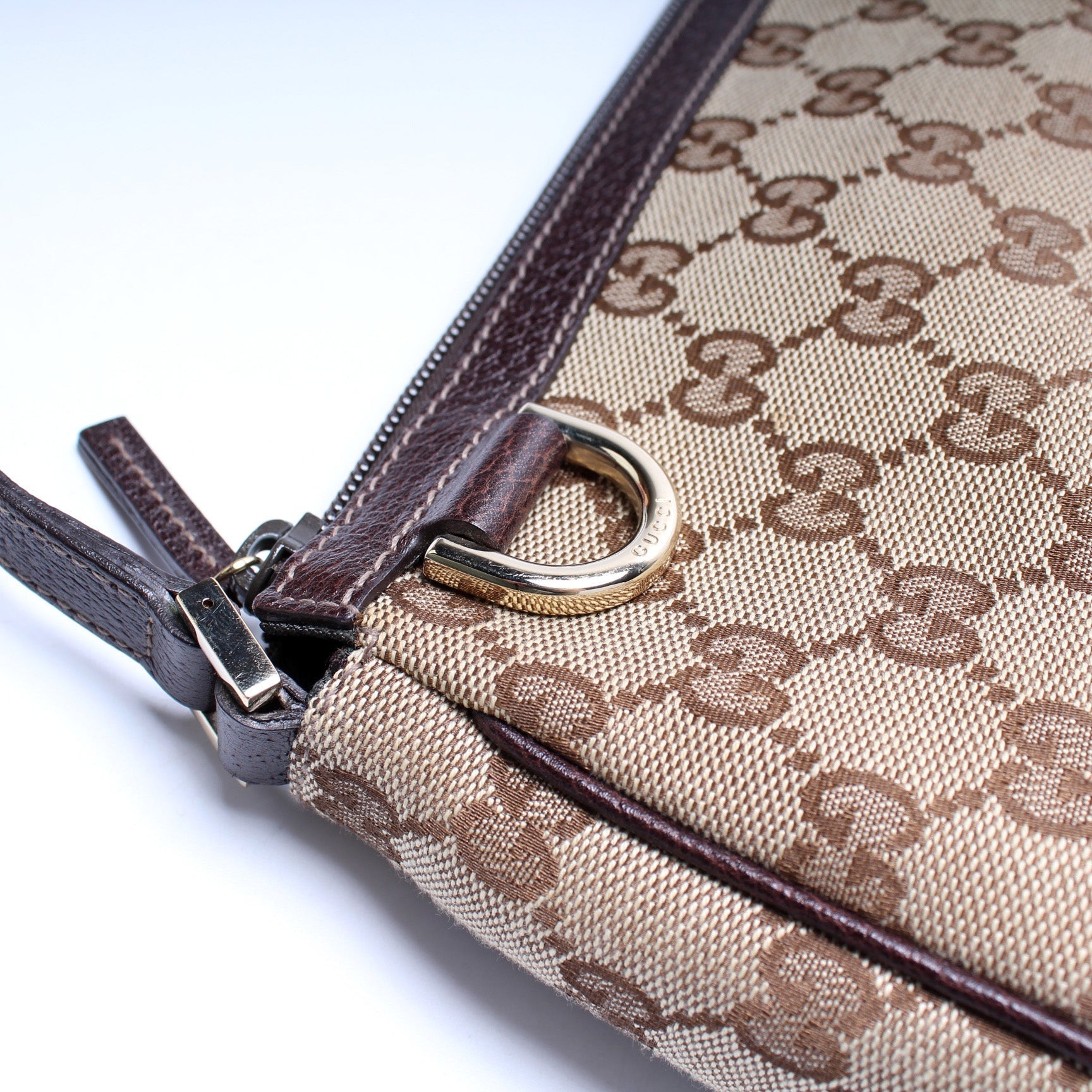 This Gucci GG Canvas D Ring Cosmetic Case is d 100% . The exterior is in the classic Gucci GG canvas.