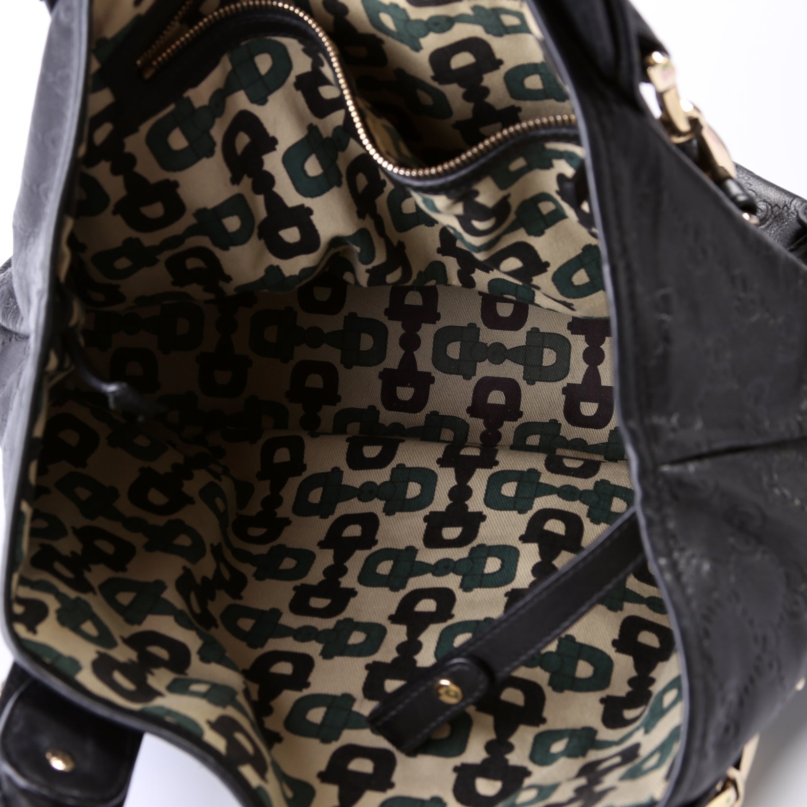 Interior: The interior shows minor discoloration throughout. The interior includes one zip closure pocket.