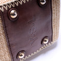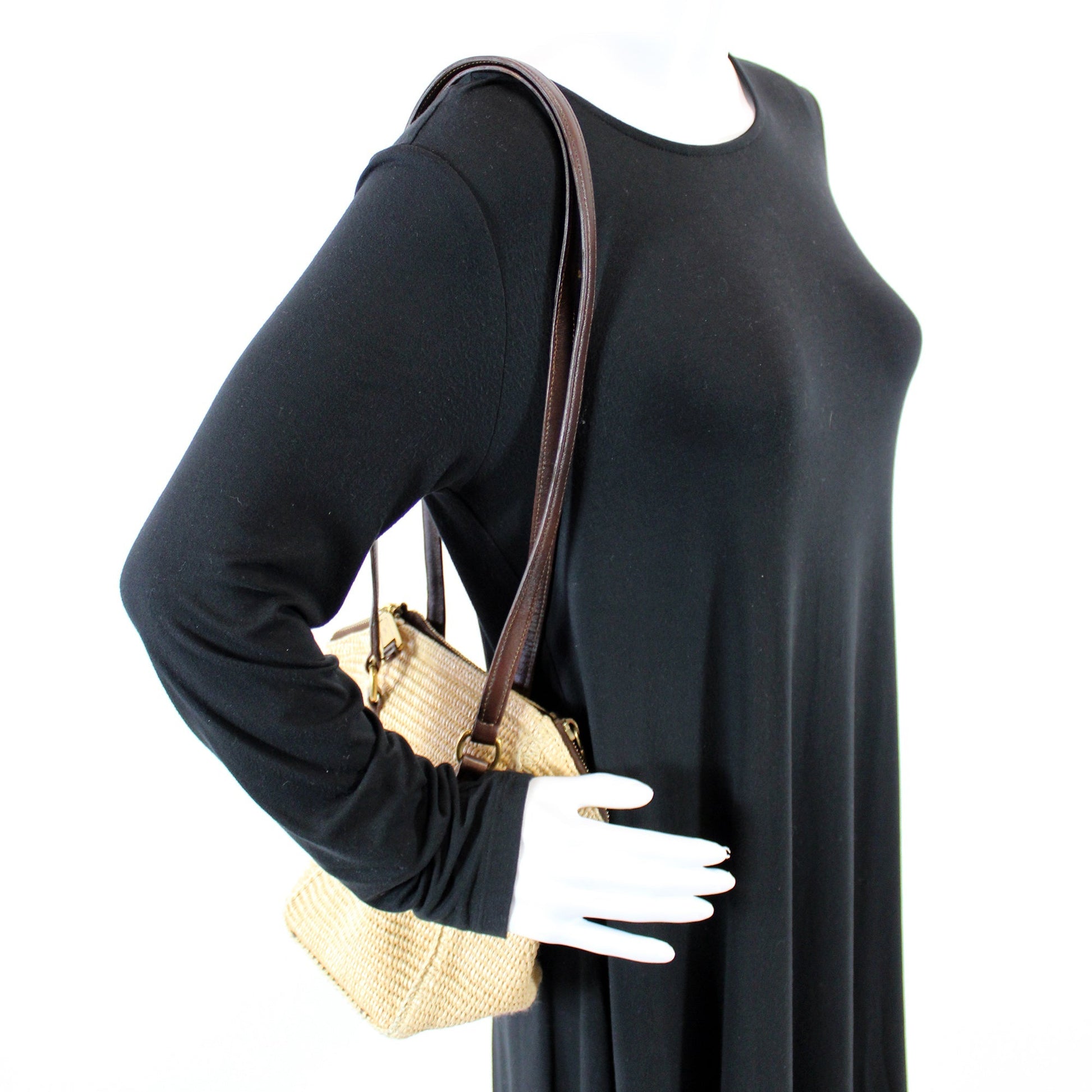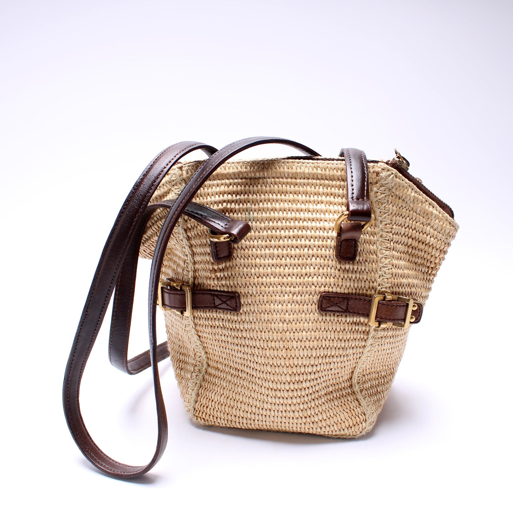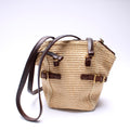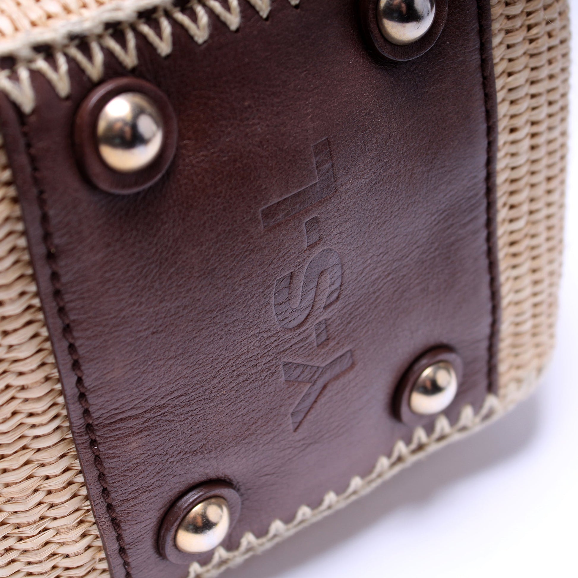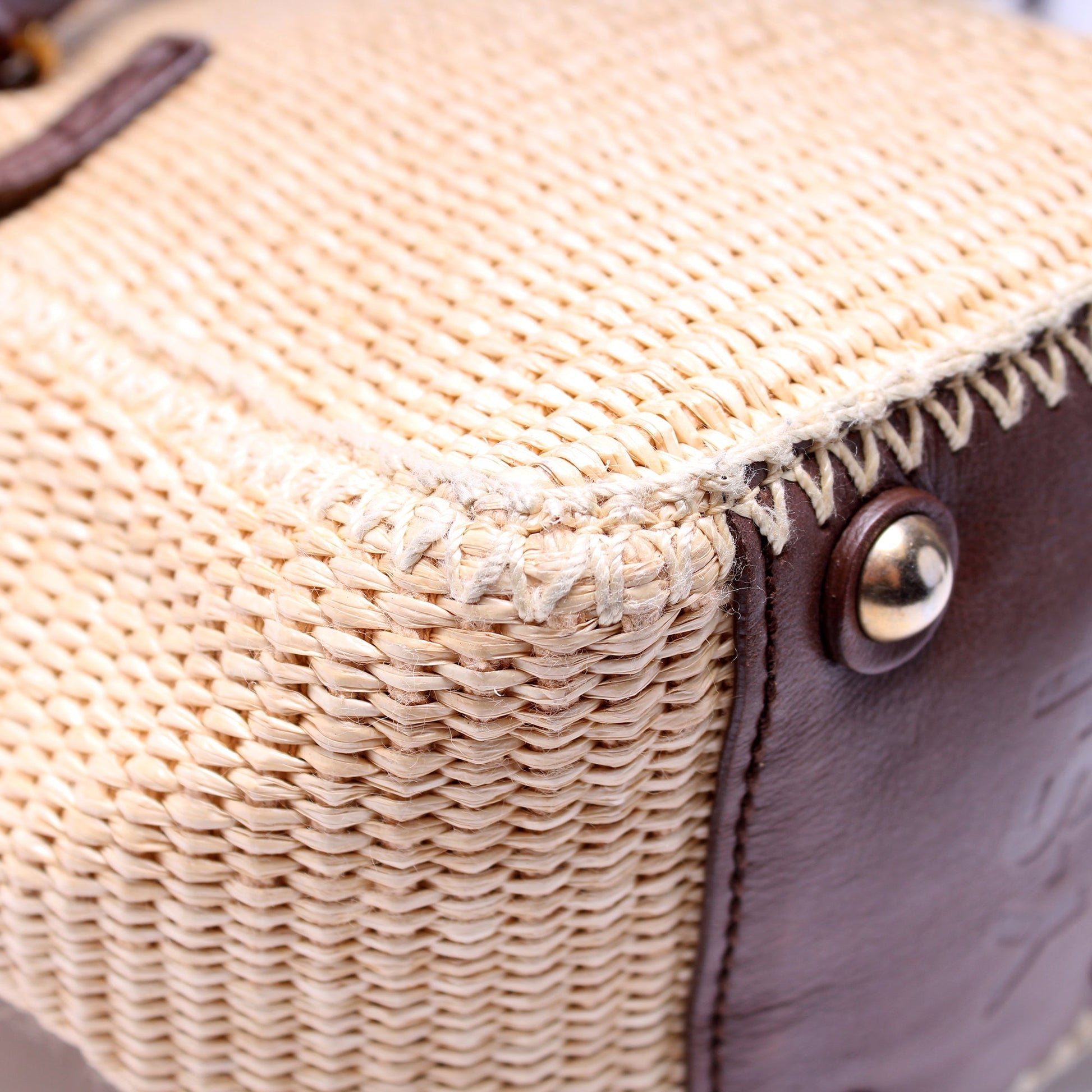 Exterior: The exterior raffia shows minor discoloration. The leather base has minor wear.