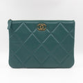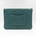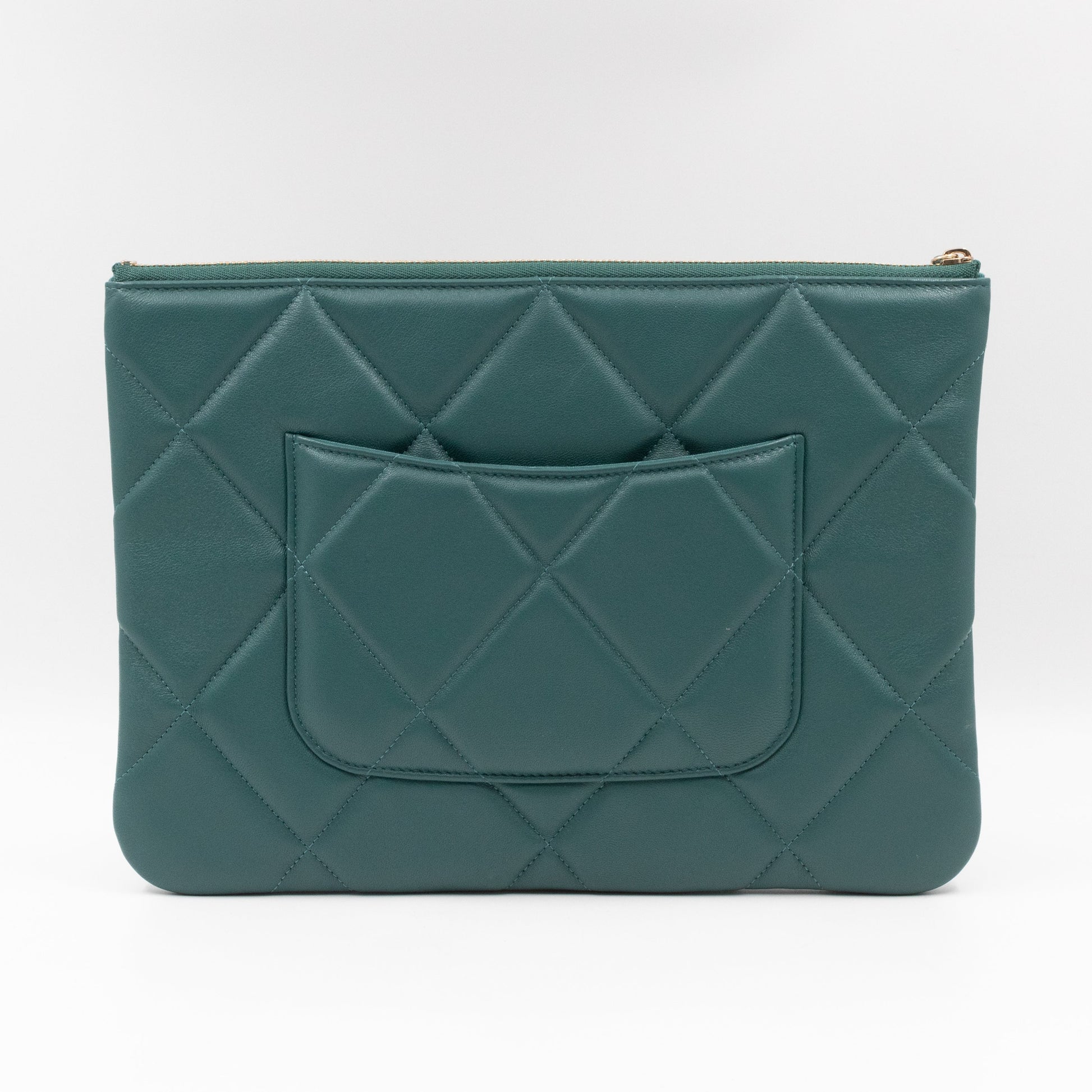 A beautiful Chanel 19 pouch. Made with a combination of large diamond quilted teal leather and gold-tone hardware, inside lining in matching textile. The front CC logo is made of a intricately designed chain link with intertwined leather, joined into a large CC shape This pouch can be used as a clutch and convenient daily accessory, it fits your phone, wallet, passport and many other small items. Has a RFID chip.