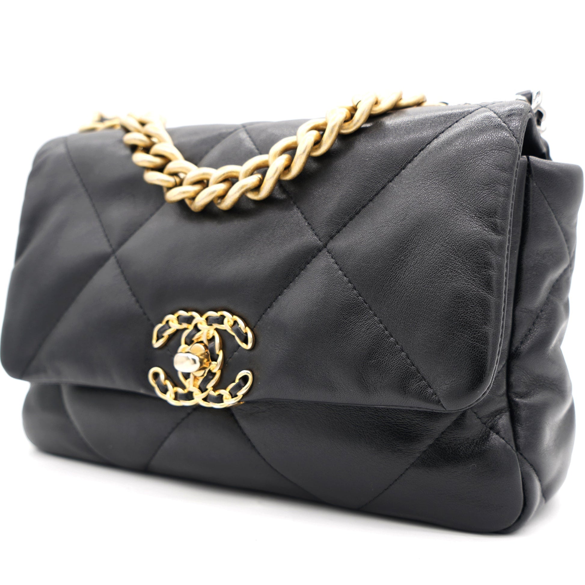 | First unveiled in the Chanel Fall 2019 collection, the Chanel 19 bag is named after the year of its release, just like the Chanel 2.55. In design, the bag has exaggerated quilting and hardware in both gold and ruthenium. The bag has a CC twist-lock and a small chain handle to be carried by hand. This version in black is made from quality leather and lined with canvas. | Material: Leather Lining: Textile Hardware: Gold-color Finish Metal Accessories:Box; Dust Bag; Receipt; Card Serial Number: 30911739 Production Year: 2021 | ![]() |