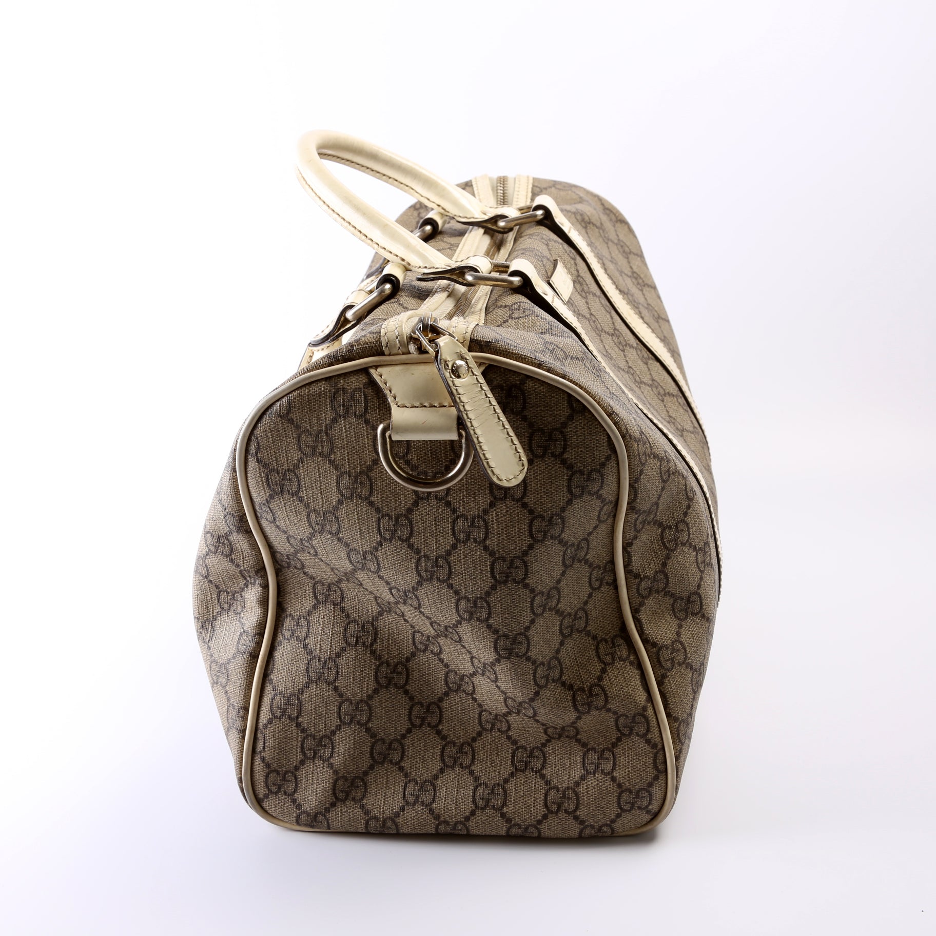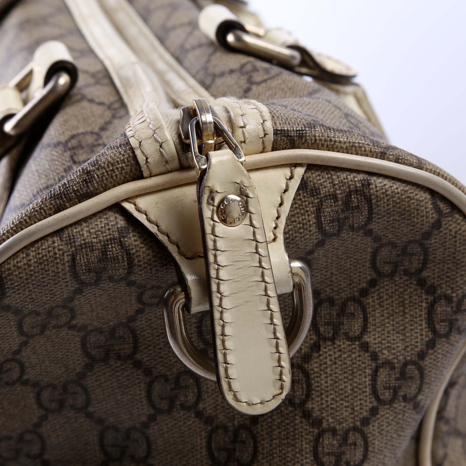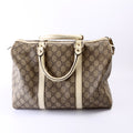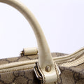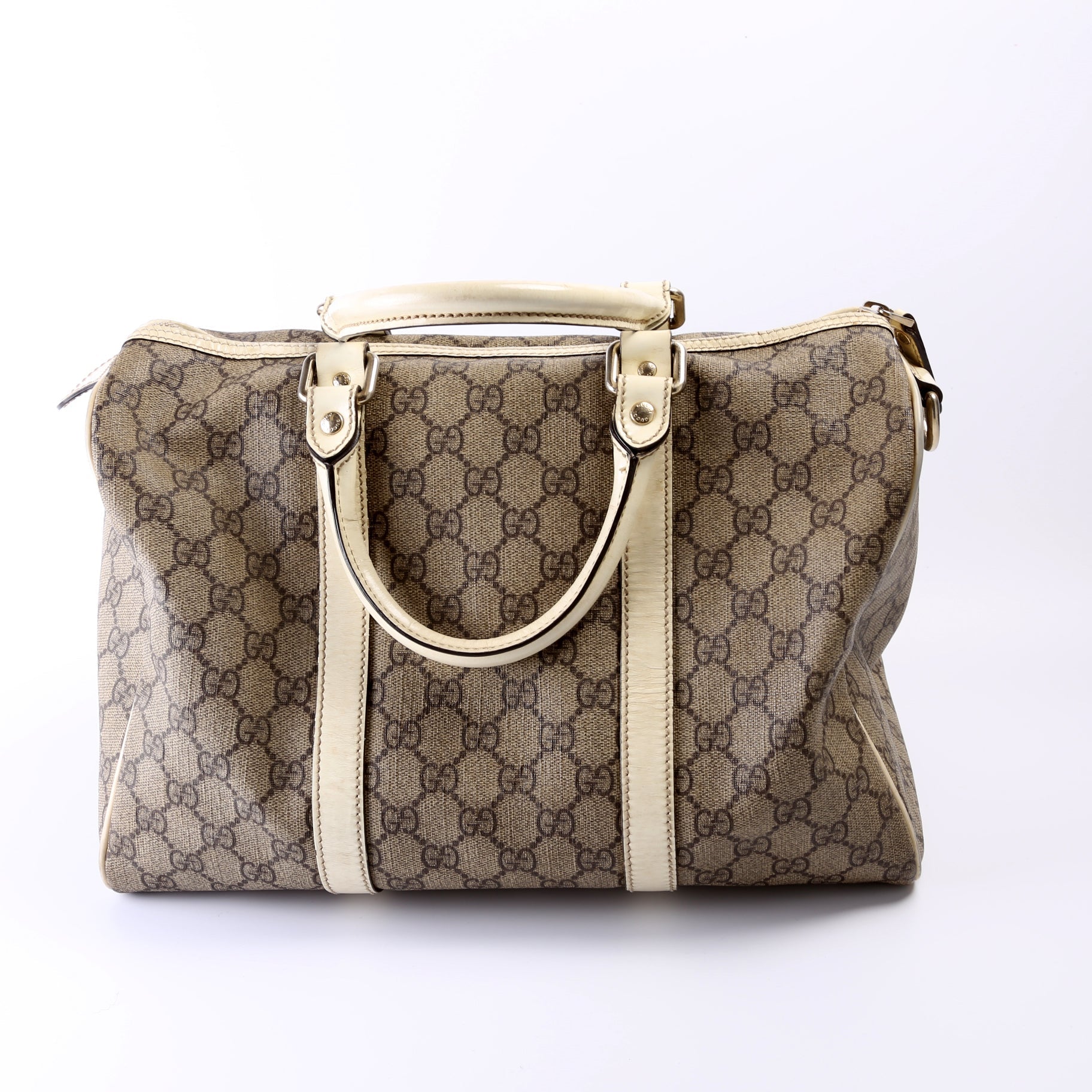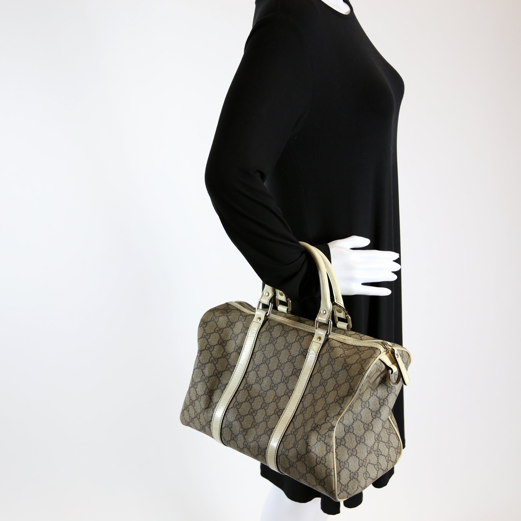 This Gucci Joy Boston Bagis eye catching bag. The exterior is in the classic Gucci GG coated canvas.