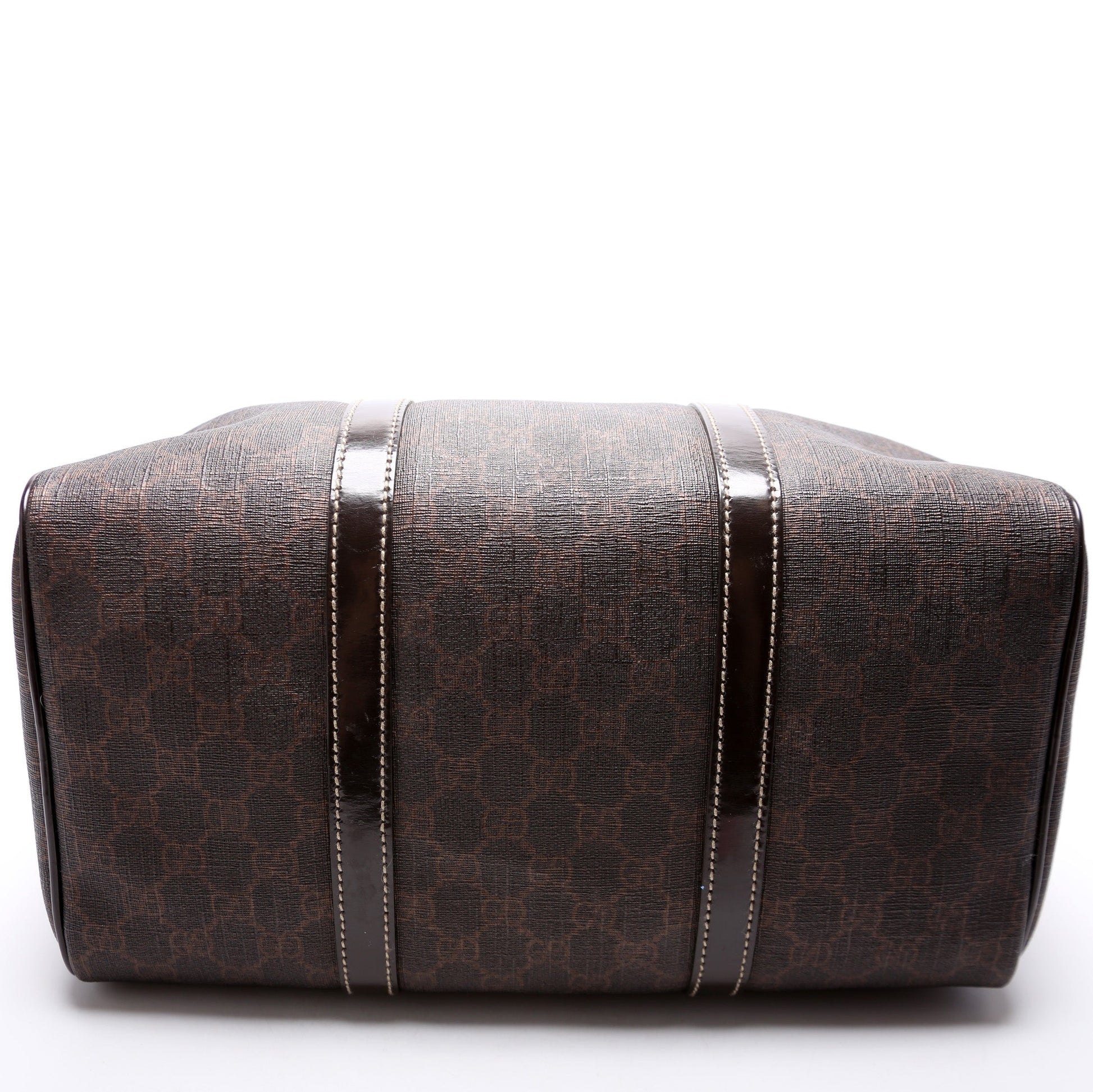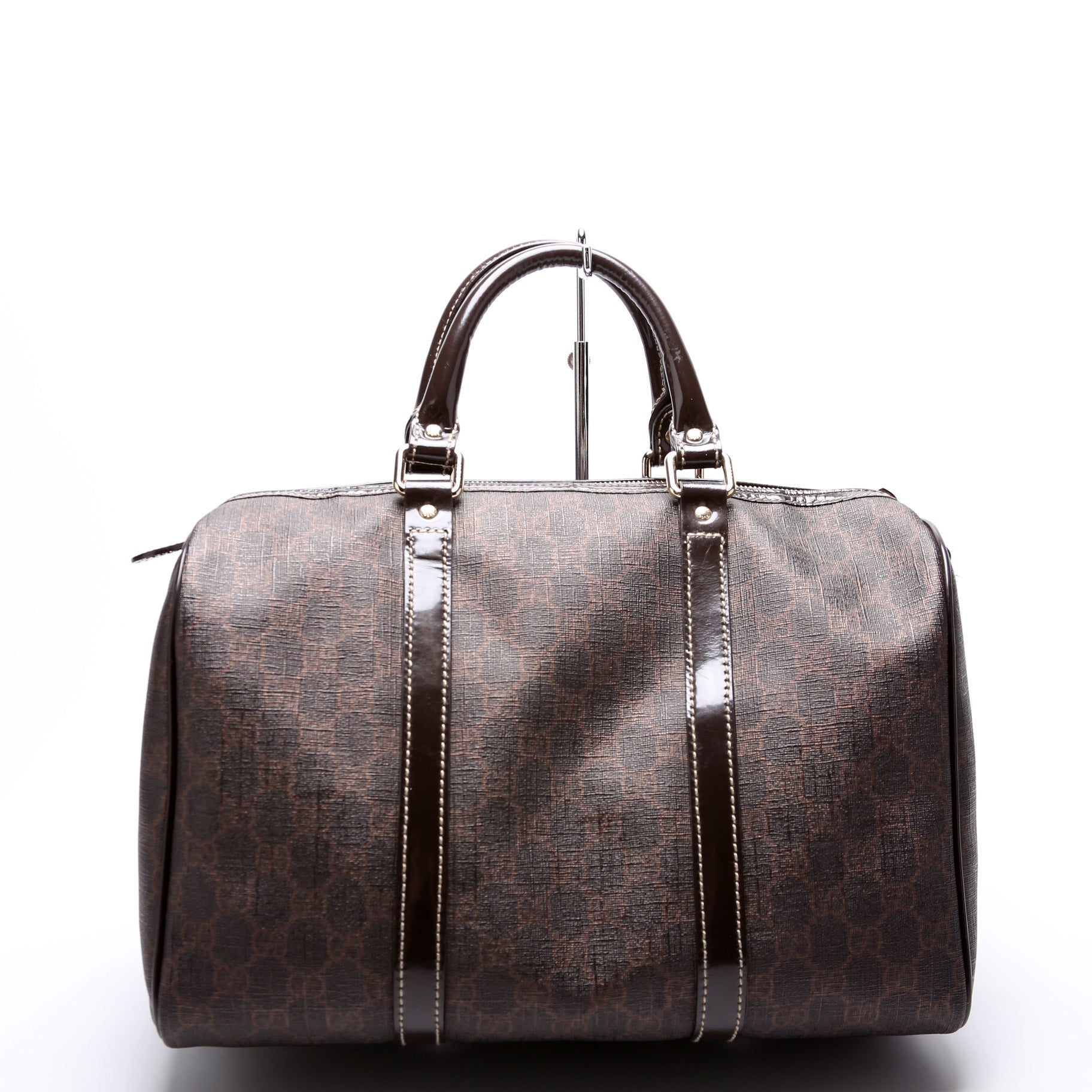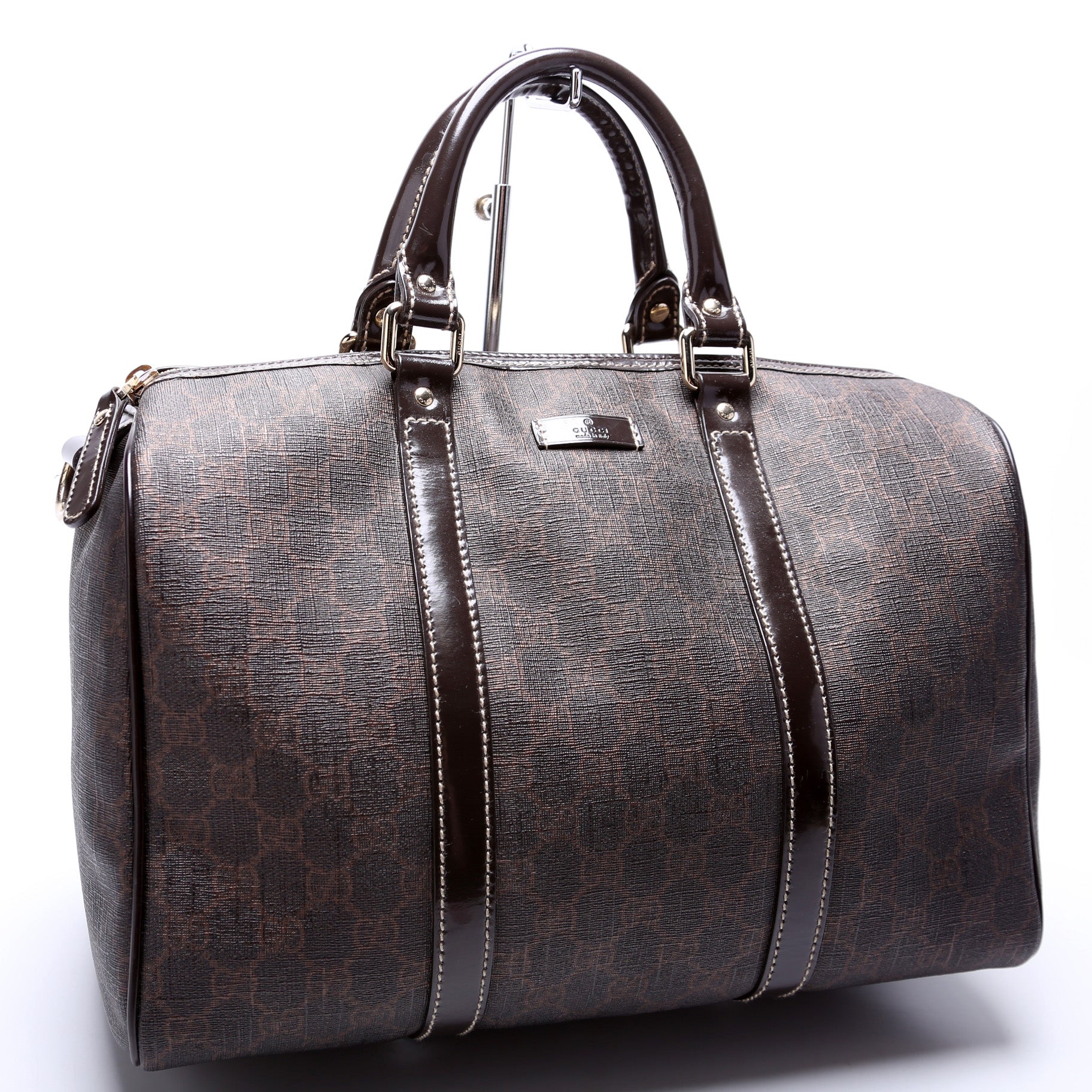 This Gucci Joy Boston Bagis eye catching bag. The exterior is in the classic Gucci GG coated canvas.