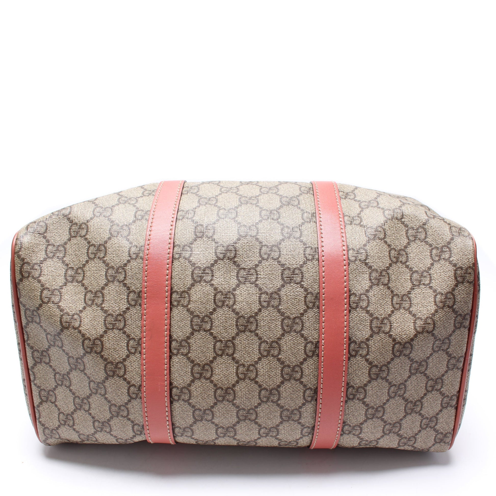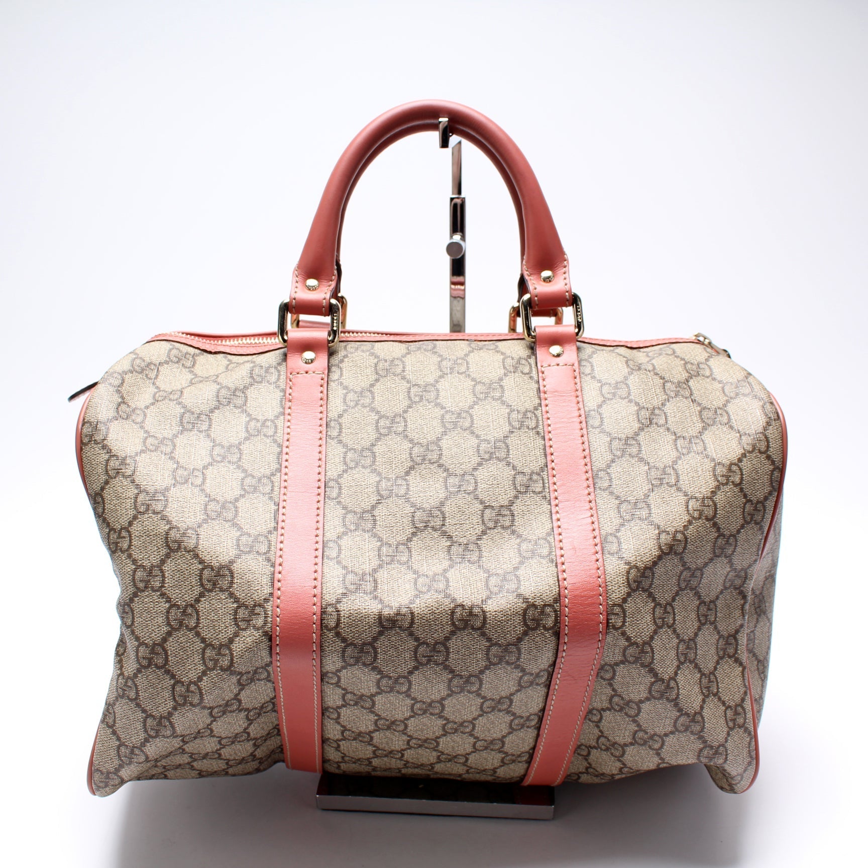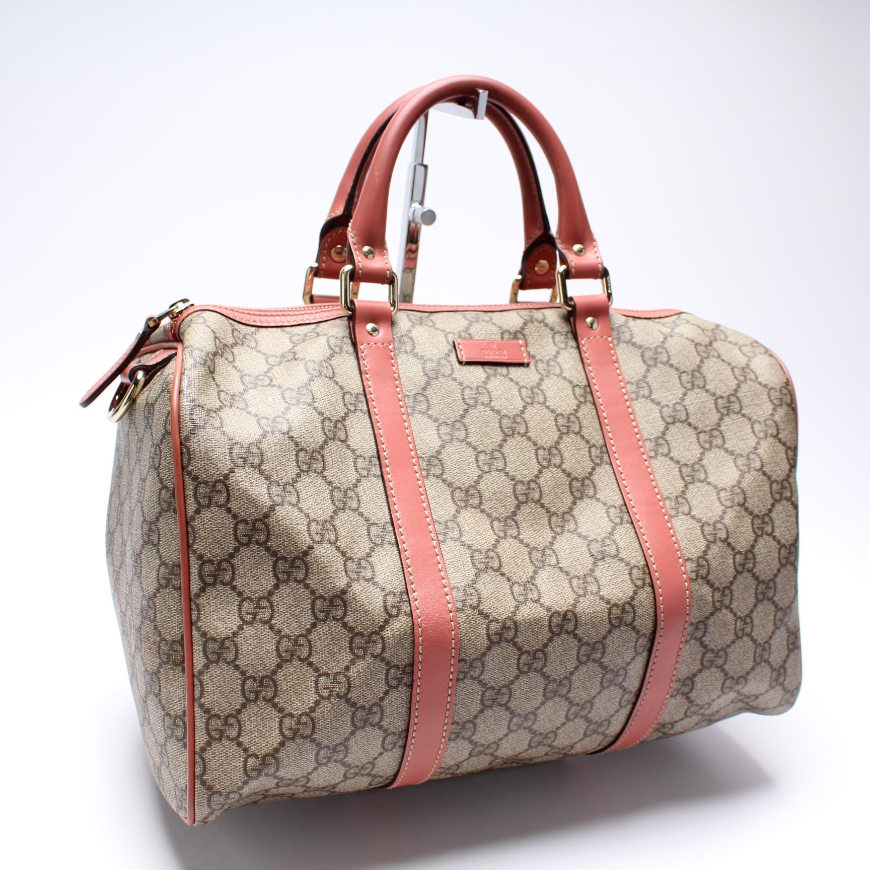 This Gucci Joy Boston Bagis eye catching bag. The exterior is in the classic Gucci GG coated canvas.