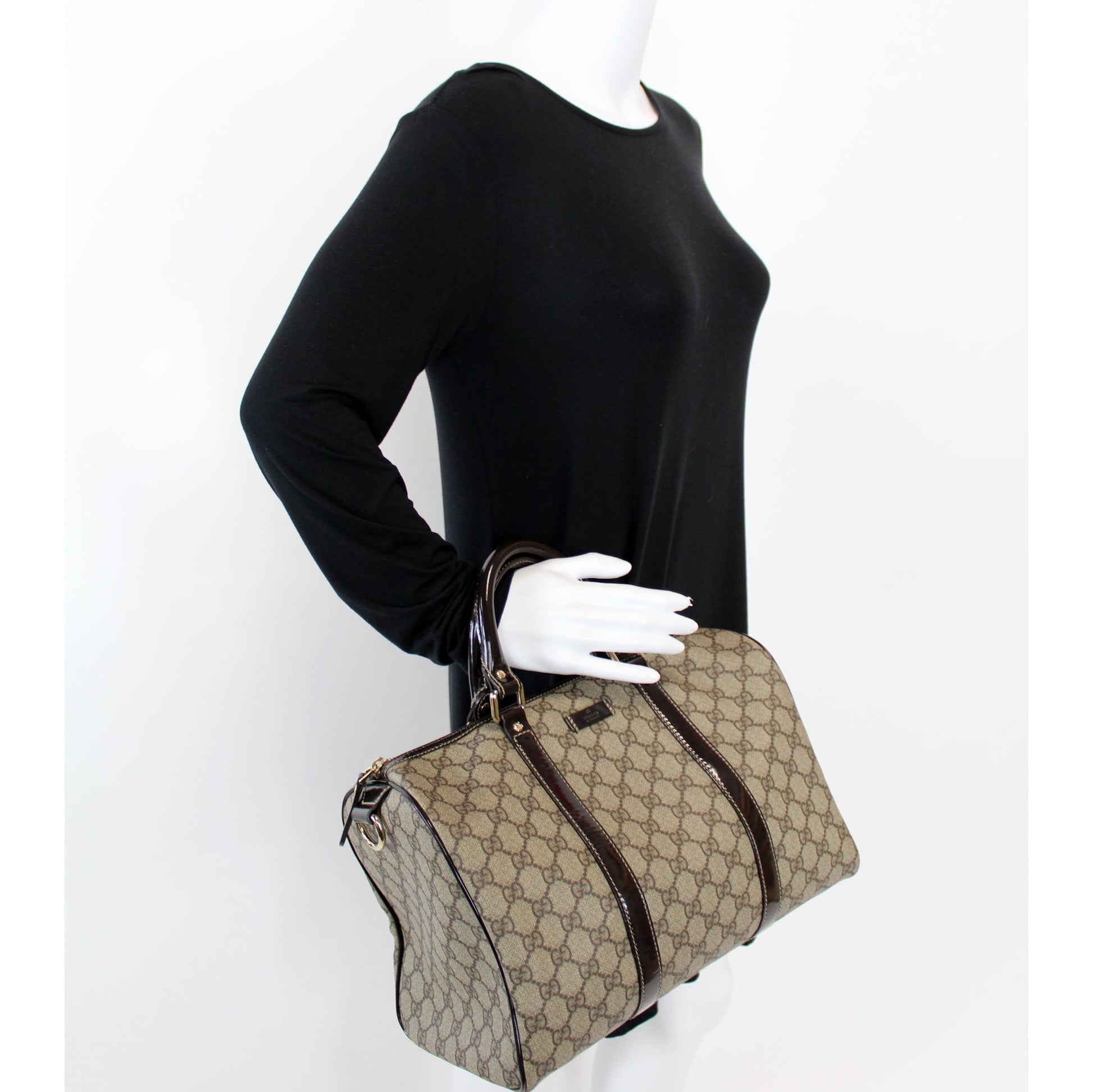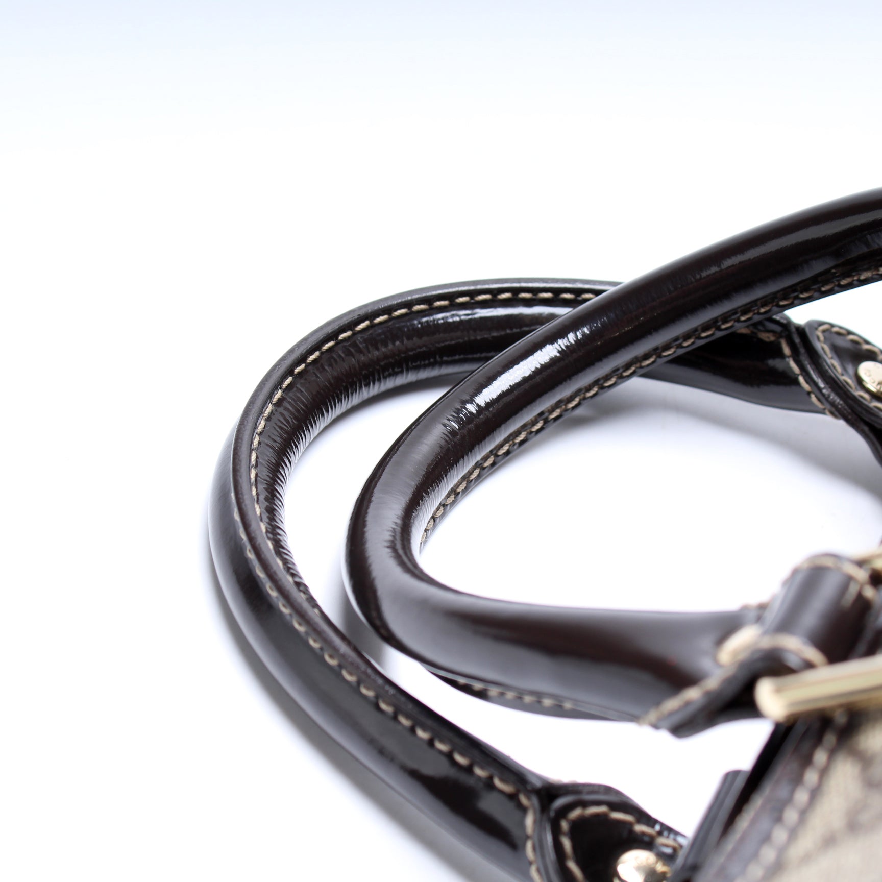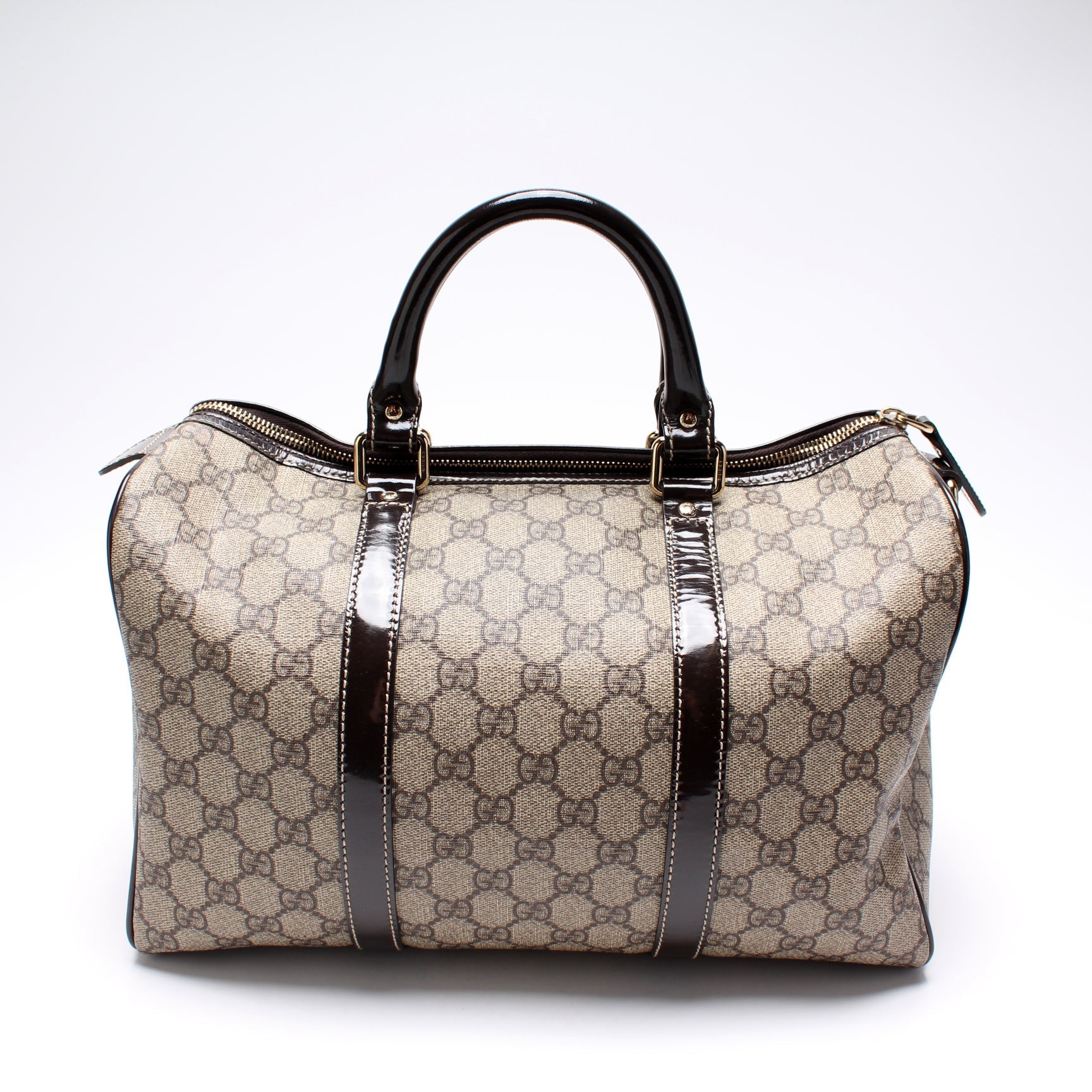 This Gucci Joy Boston Bagis eye catching bag. The exterior is in the classic Gucci GG coated canvas.