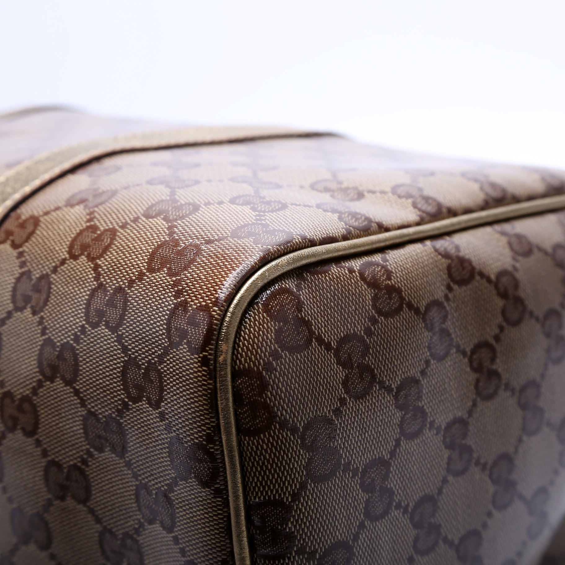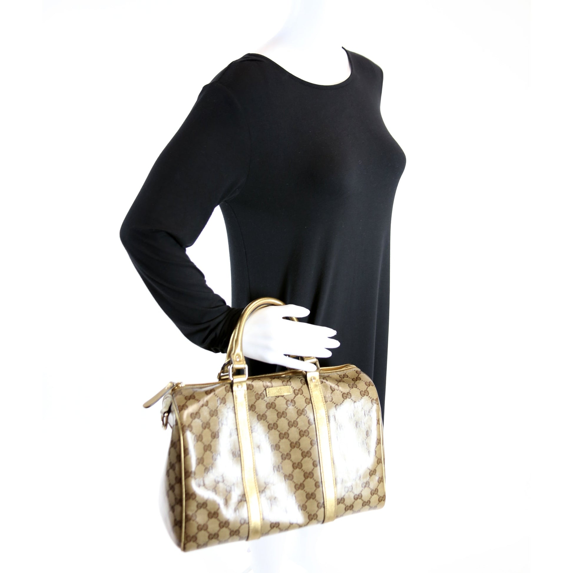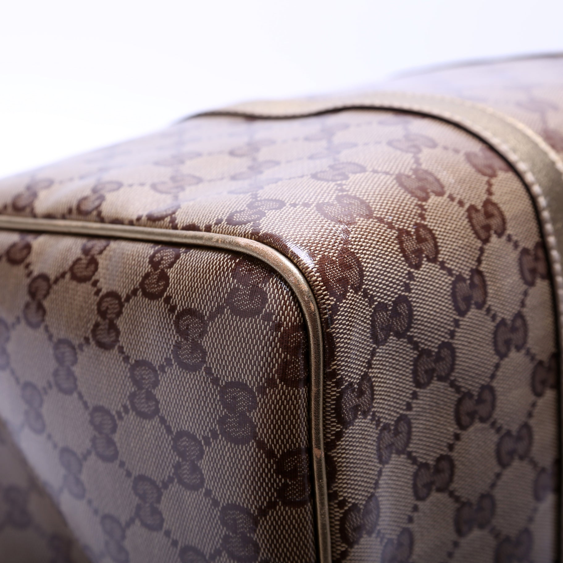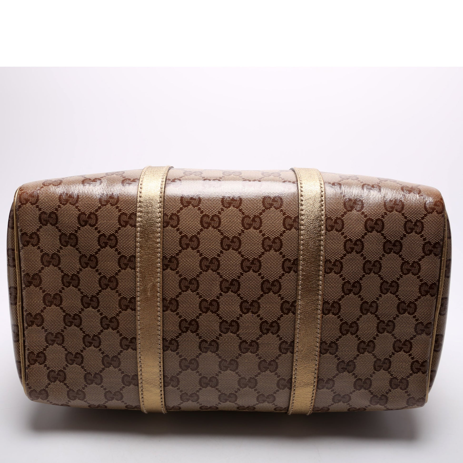 This Gucci Joy Boston Bagis eye catching bag. The exterior is in the classic Gucci GG Crystal coated canvas.
