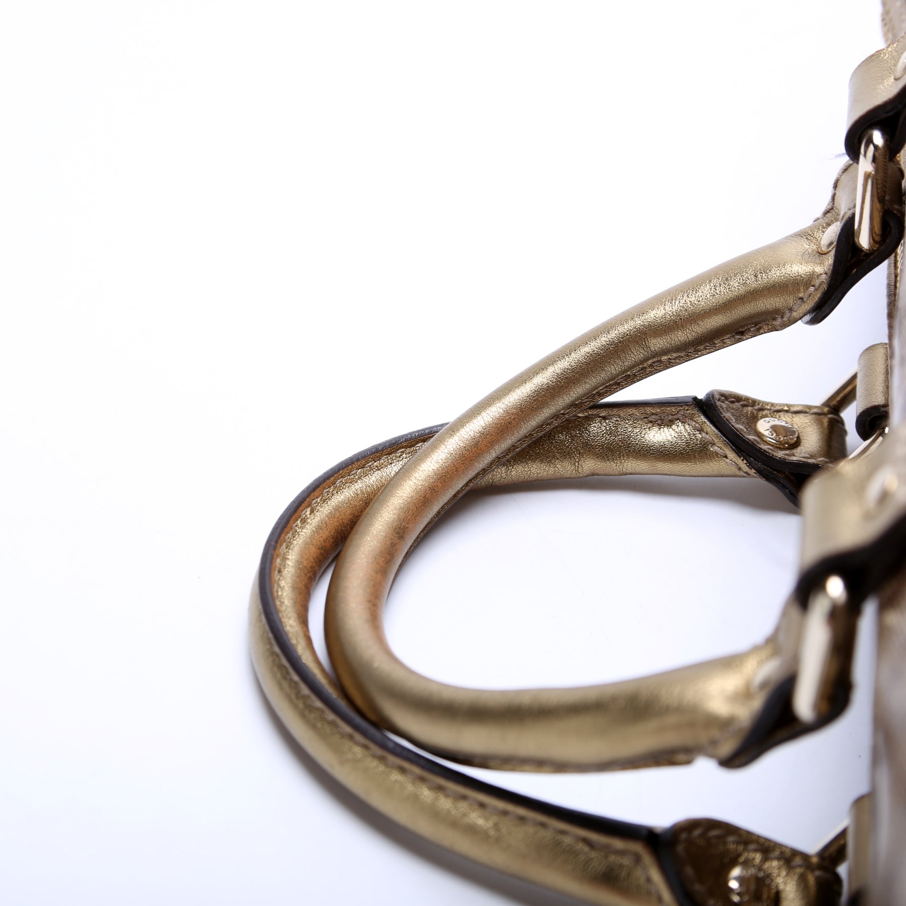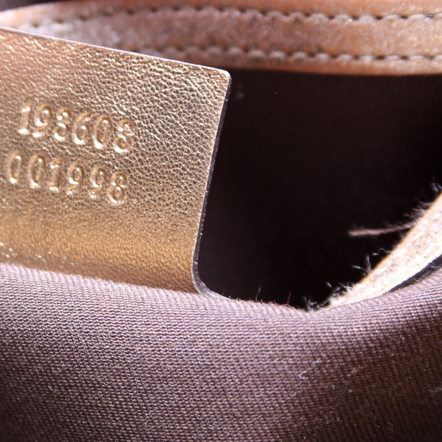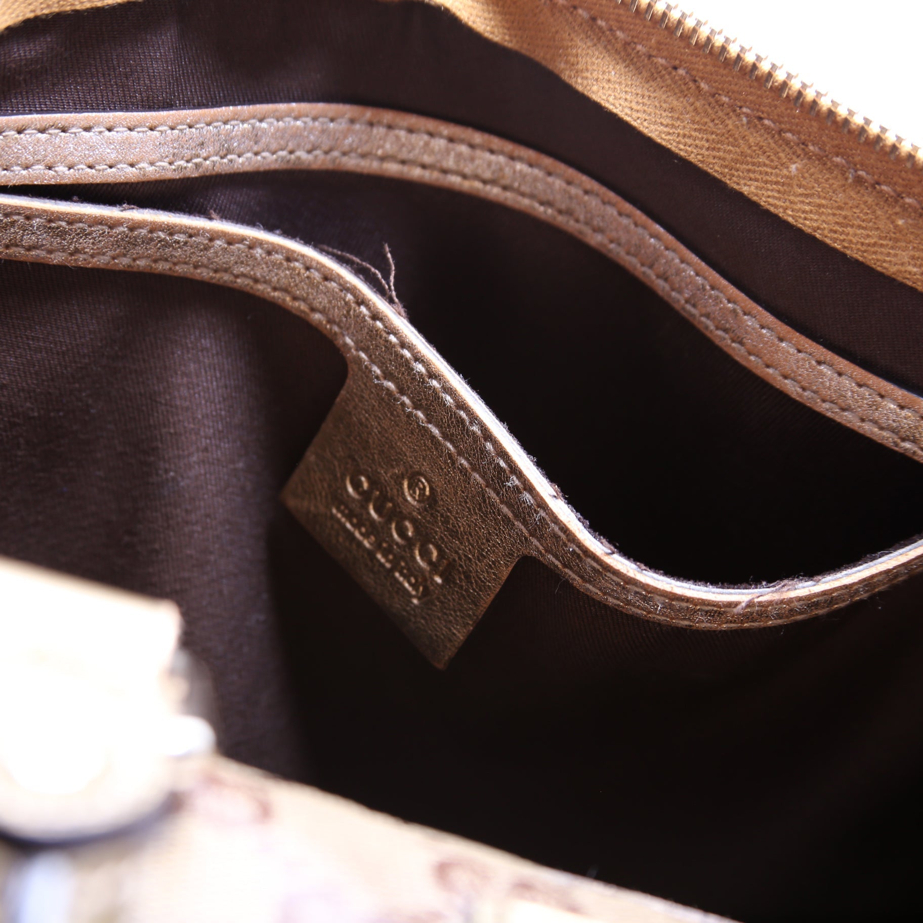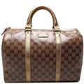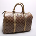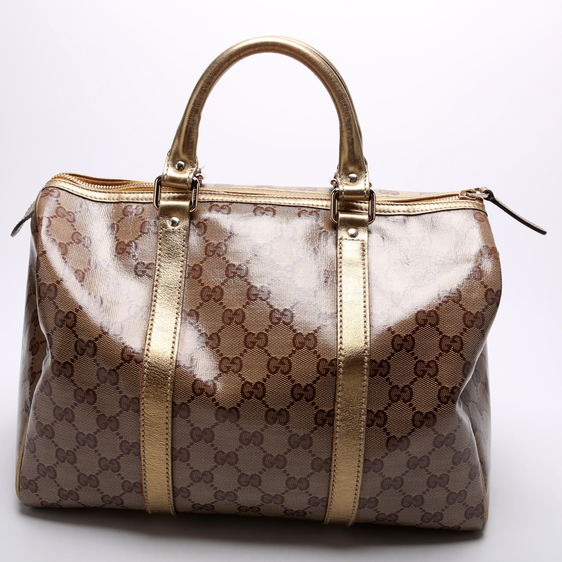 This Gucci Joy Boston Bagis eye catching bag. The exterior is in the classic Gucci GG Crystal coated canvas.