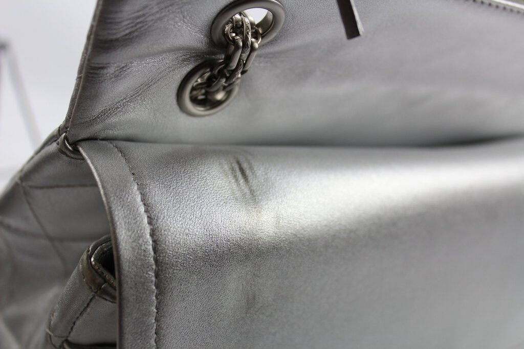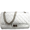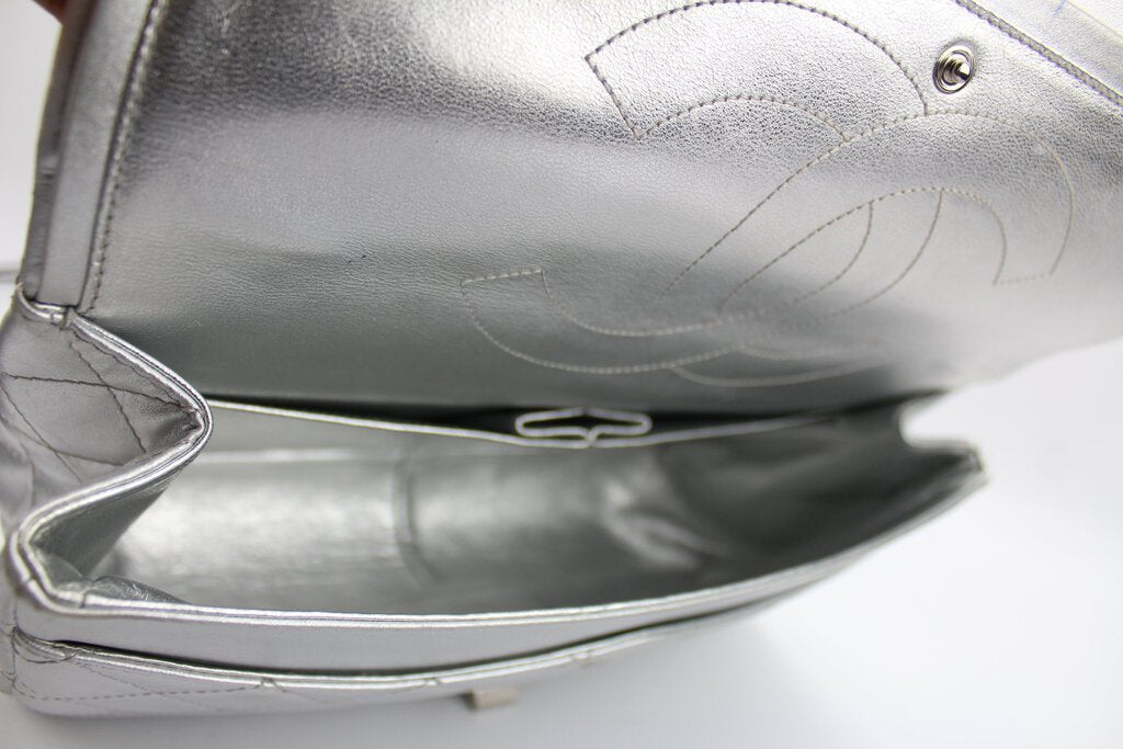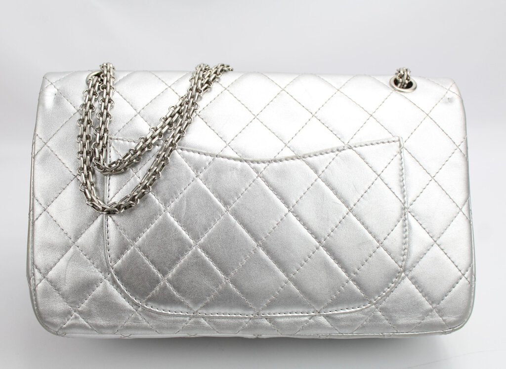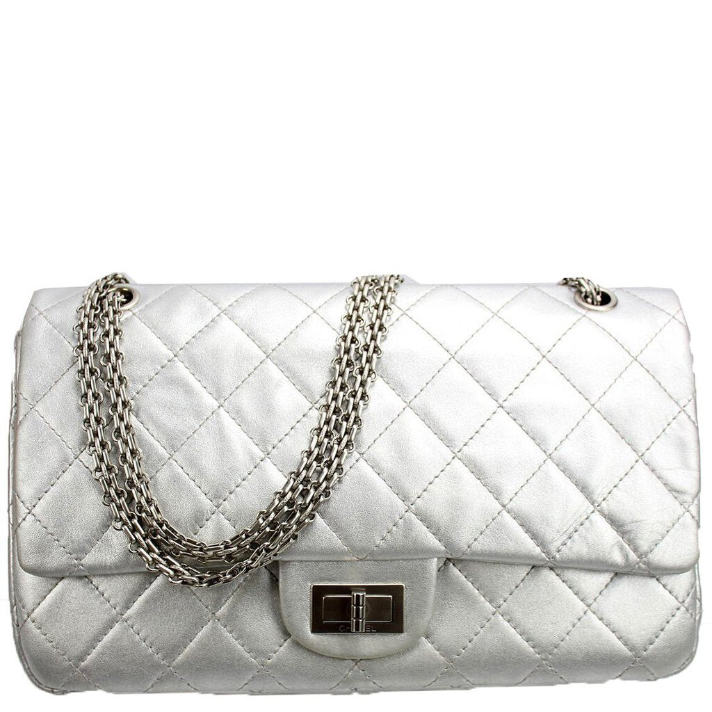 This Silver Chanel 2.55 Reissue 227 Flap Bagis eye catching bag. The exterior is in the classic Chanel lambskin leather.