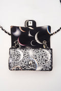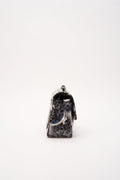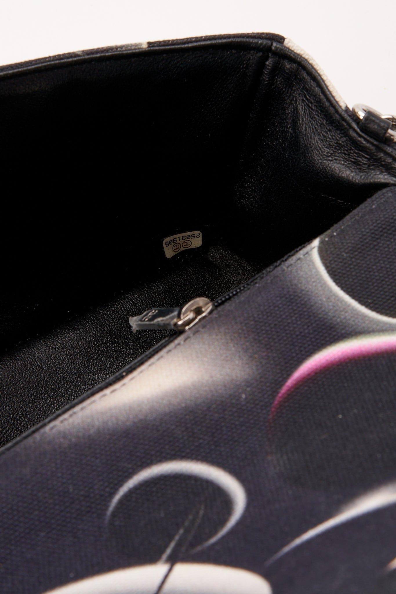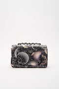 A classic flap bag crafted from a printed canvas, transparent sequins and silver hardware.