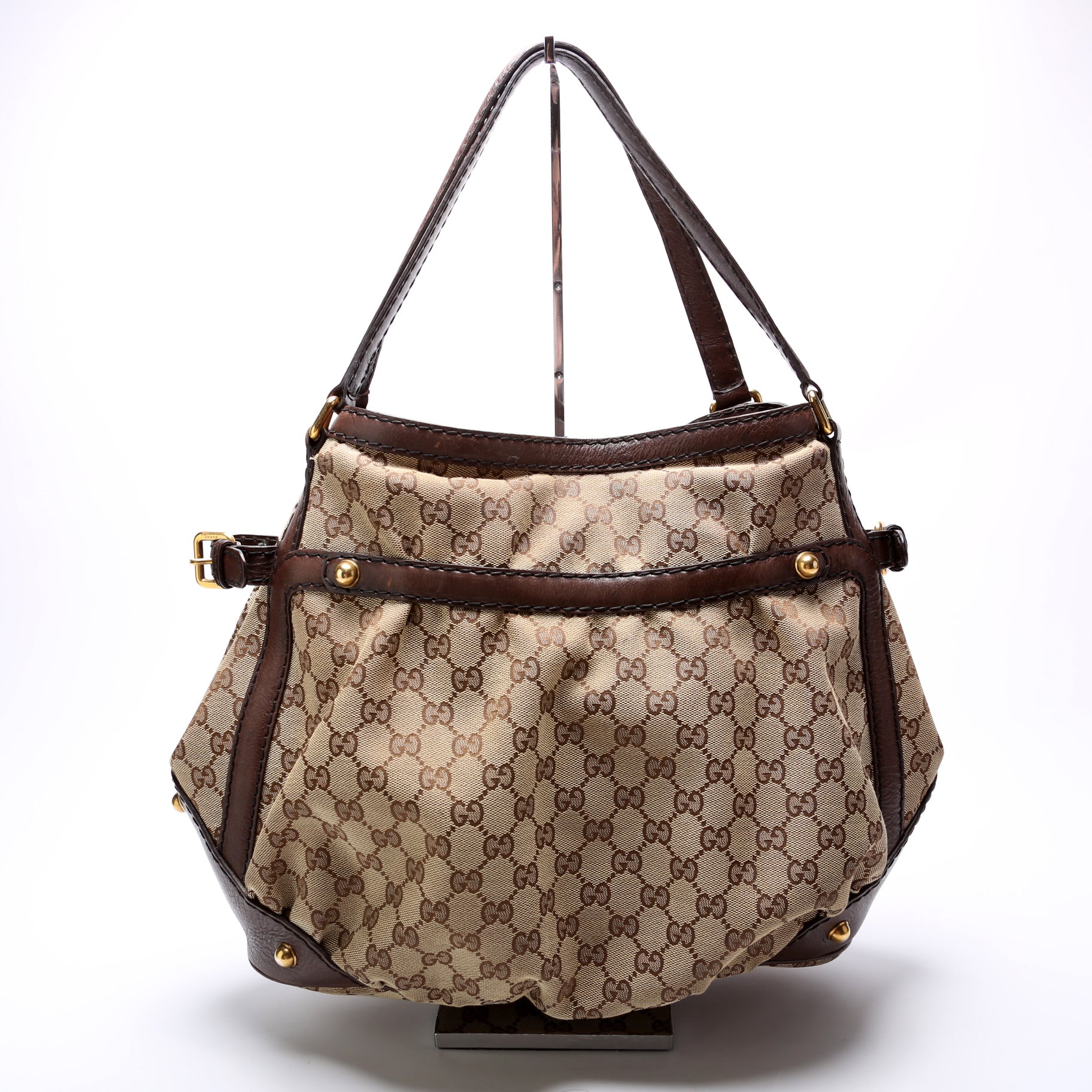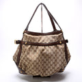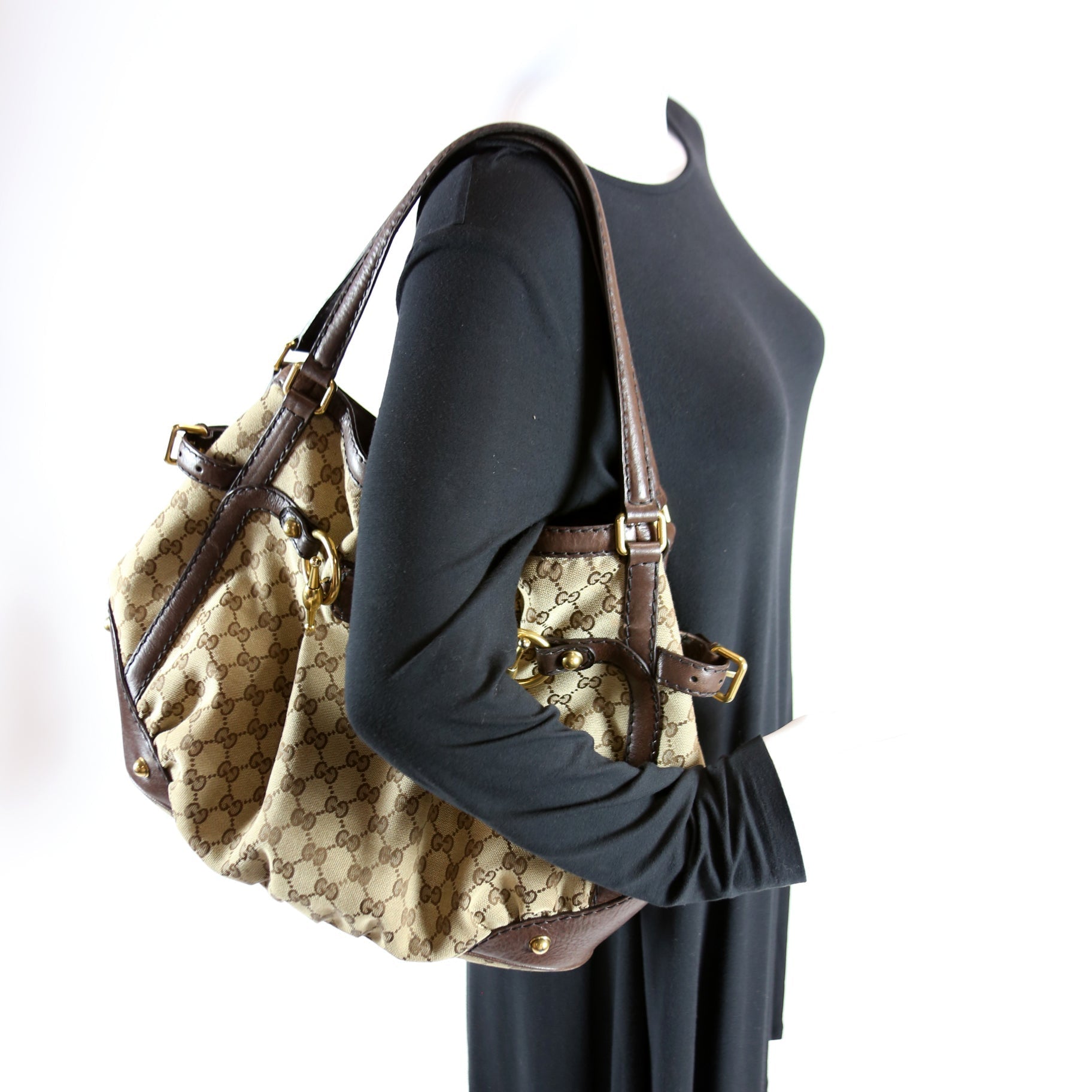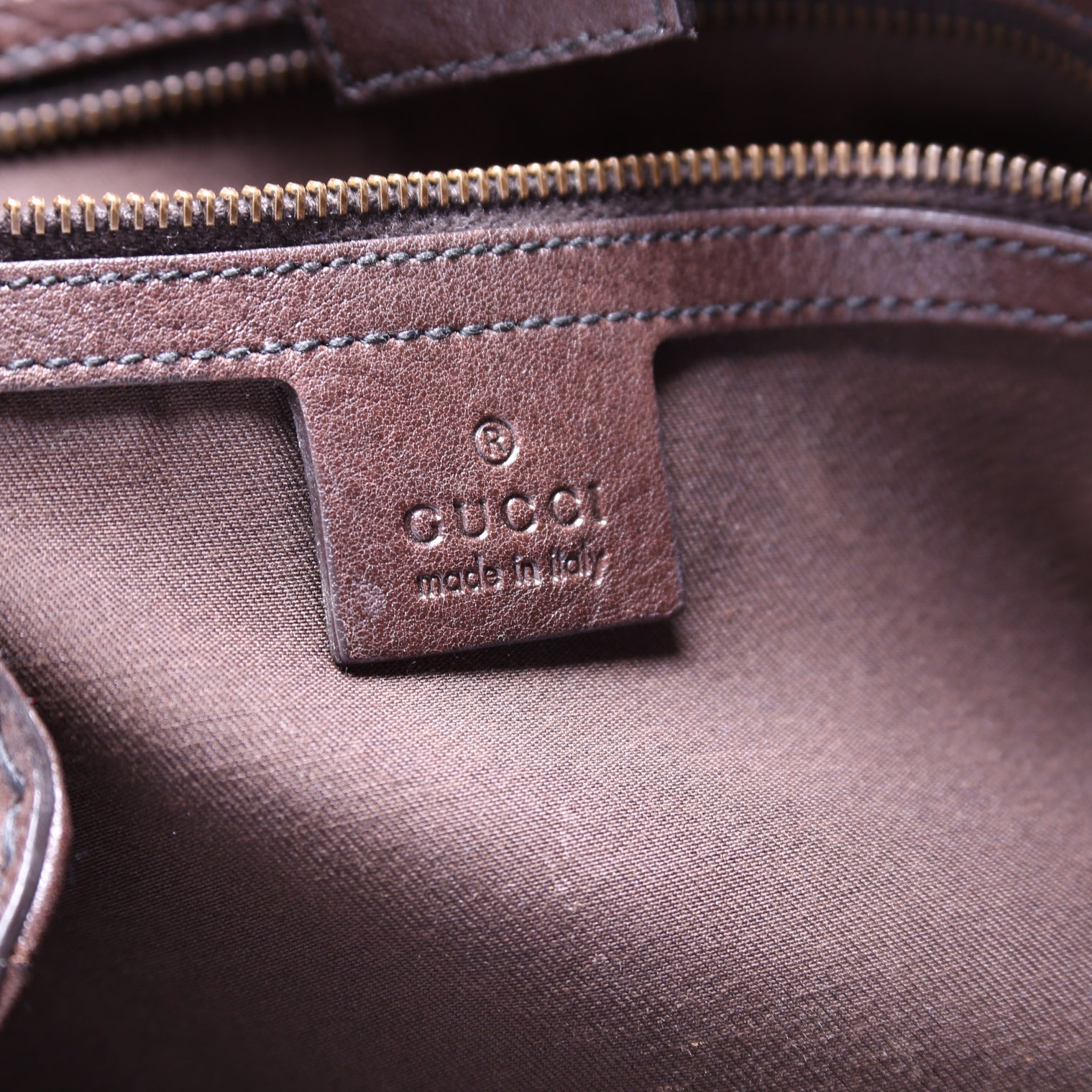 This Gucci GG Canvas Jockey Medium Toteis eye catching bag. The exterior is in the classic Gucci GG canvas.