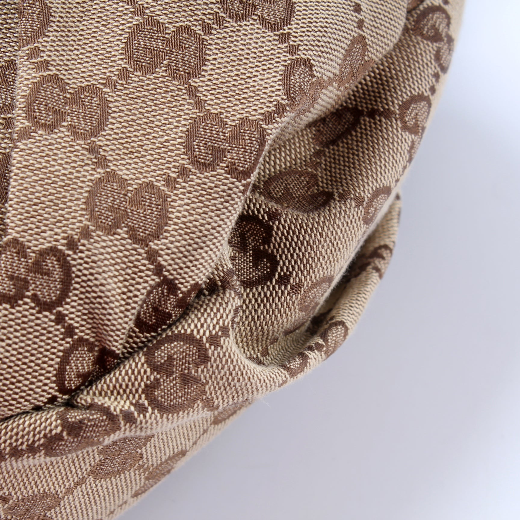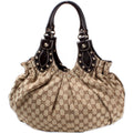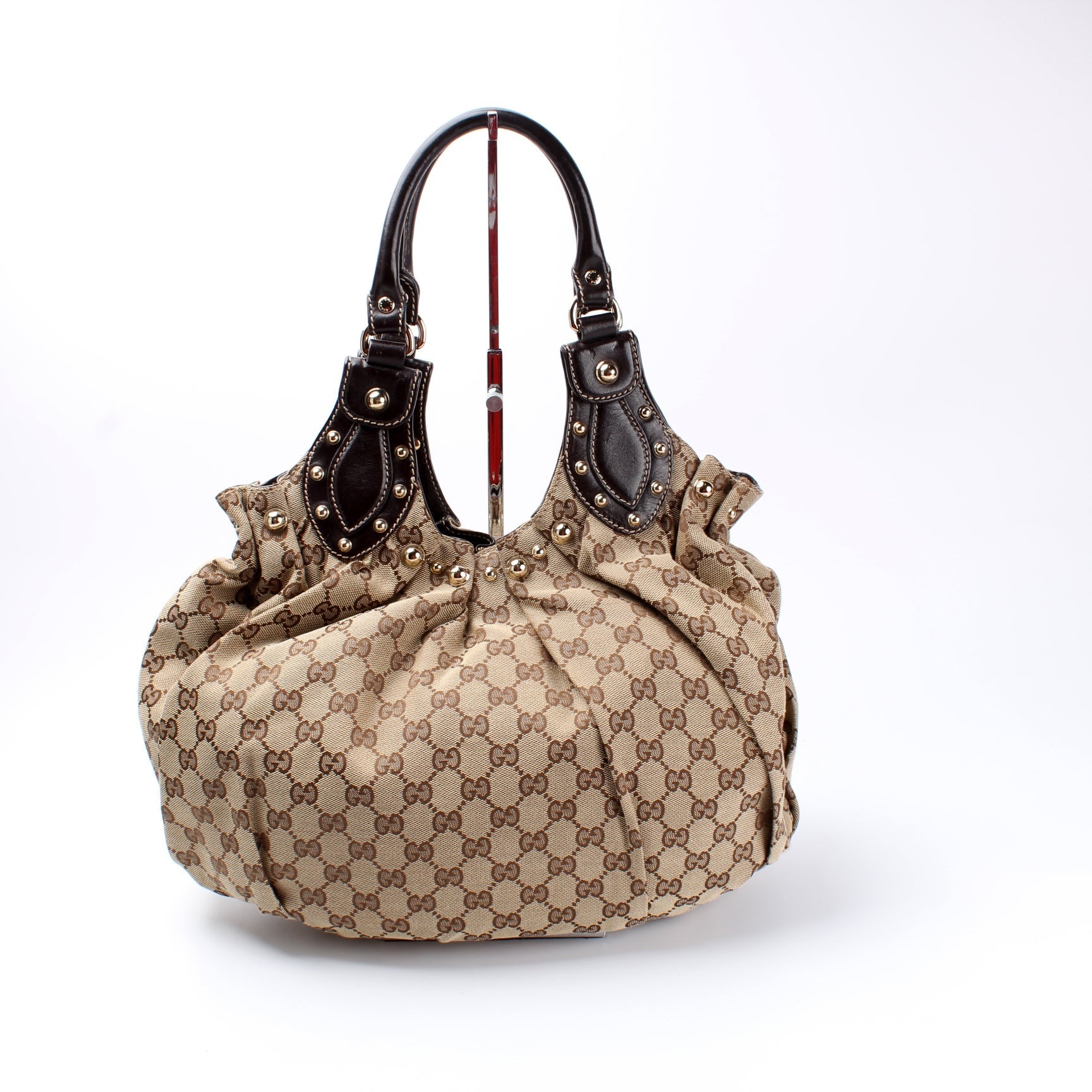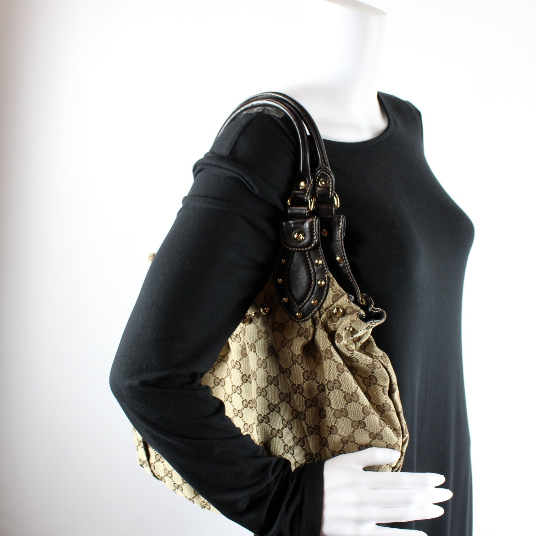 This Gucci Canvas Studded Pelam Medium is eye catching bag. The exterior is in the classic GG canvas.