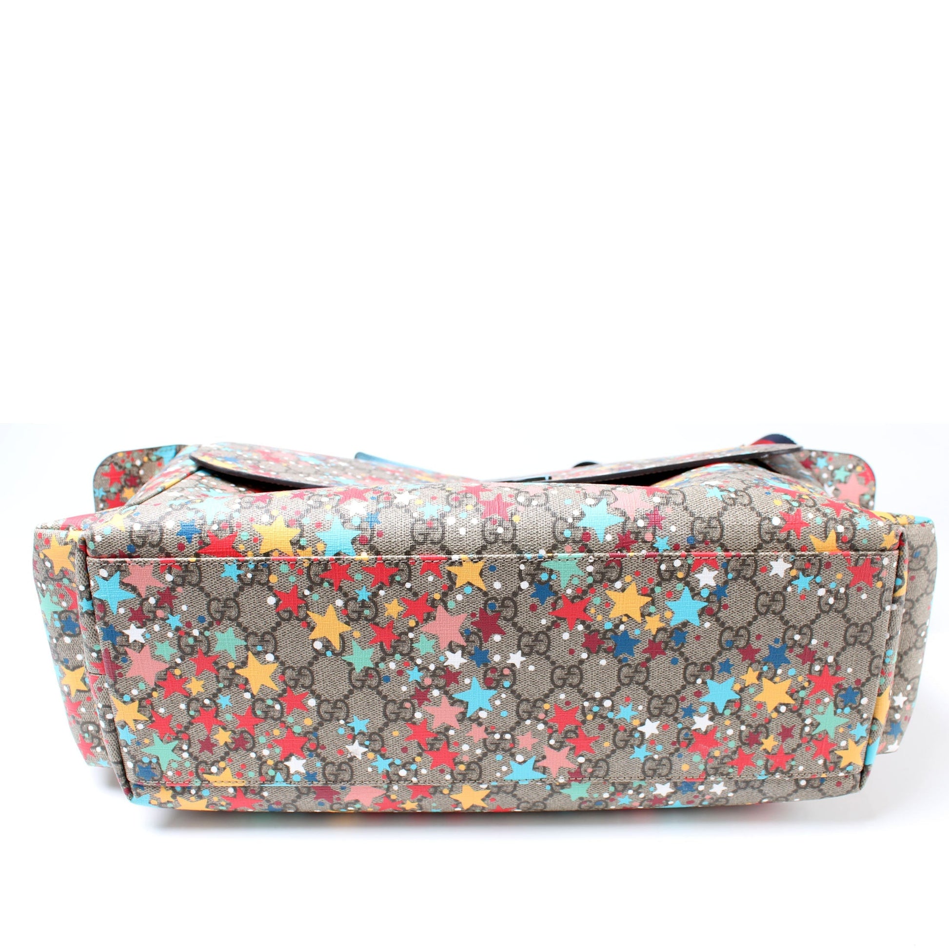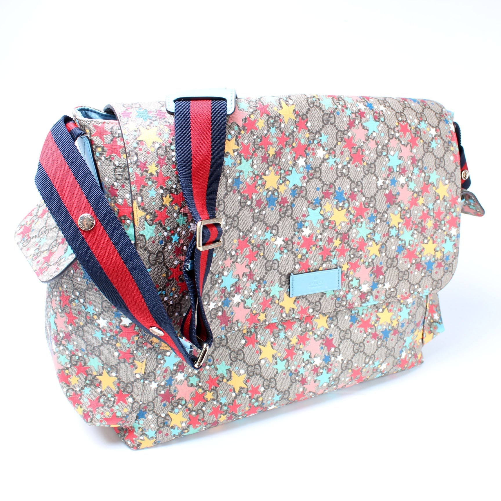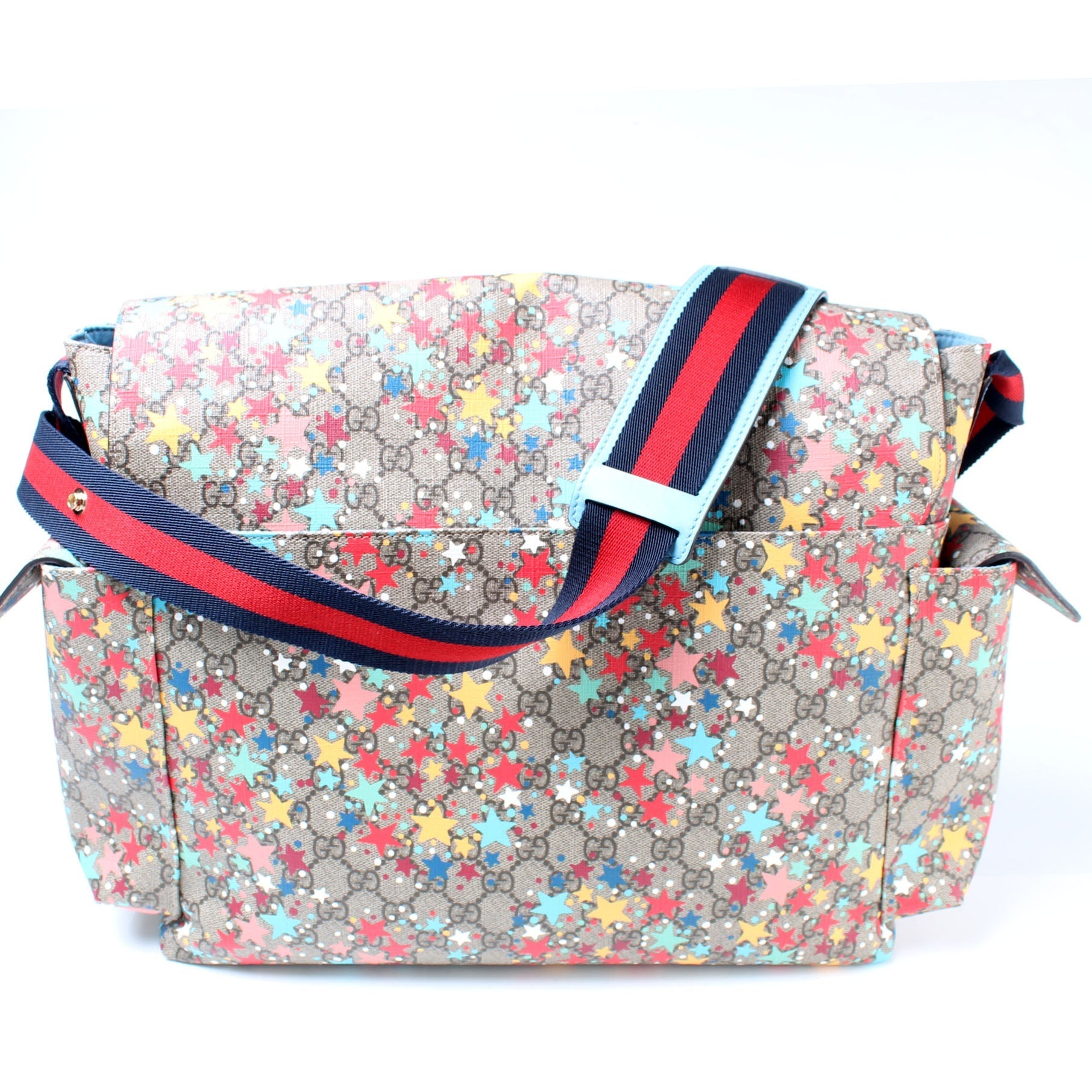 This Gucci Diaper Bagis eye catching bag. The exterior is in the classic Gucci GG coated canvas.