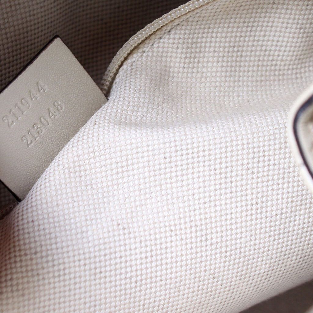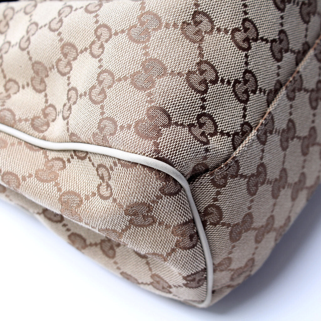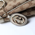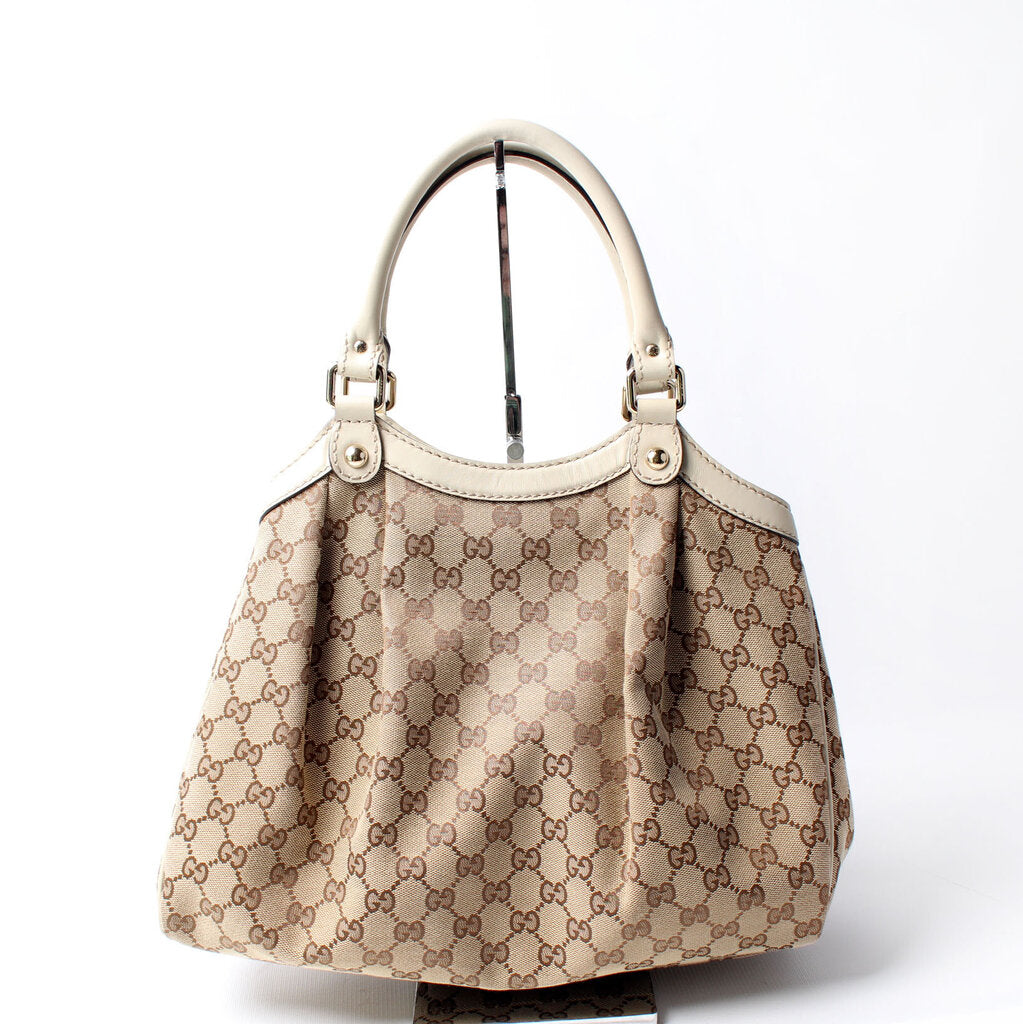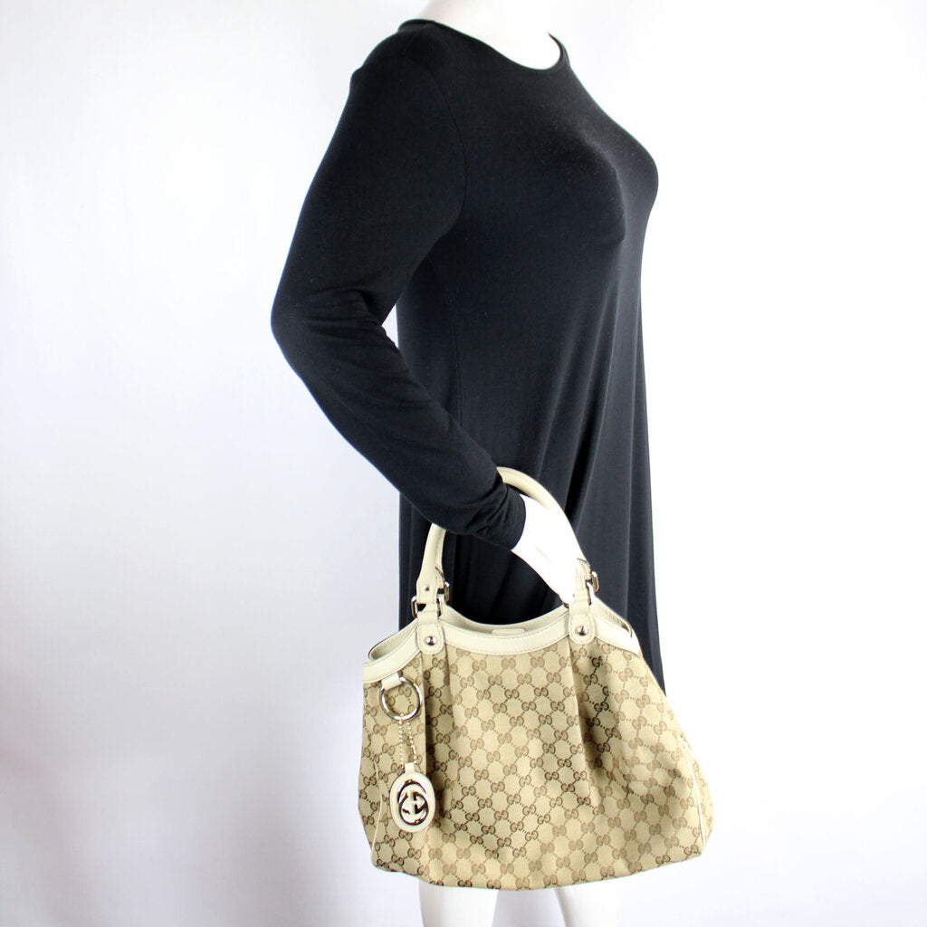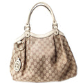 This Gucci Sukey Mediumis eye catching bag. The exterior is in the Gucci canvas.
