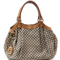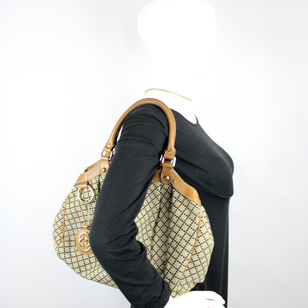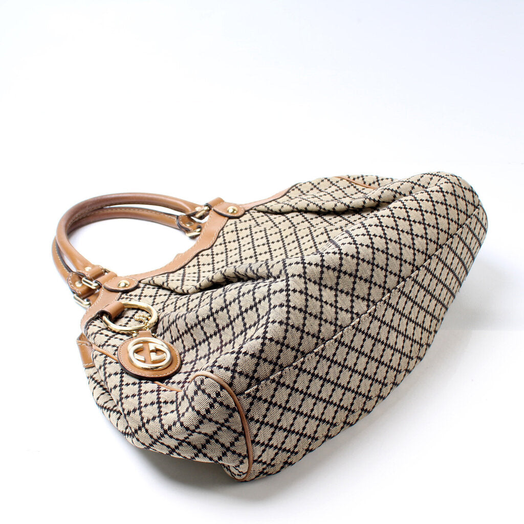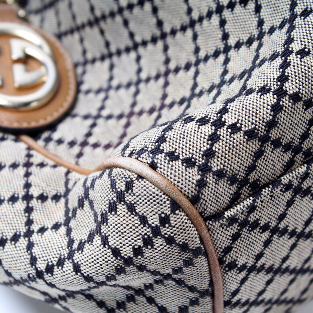 This Gucci Sukey Mediumis eye catching bag. The exterior is in the classic Gucci GG canvas.