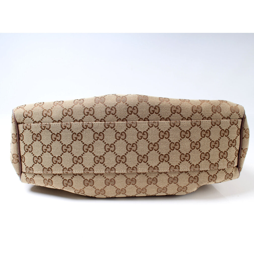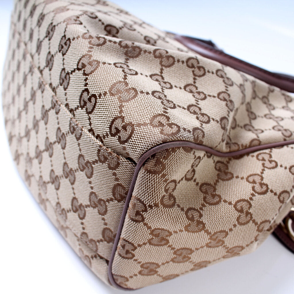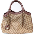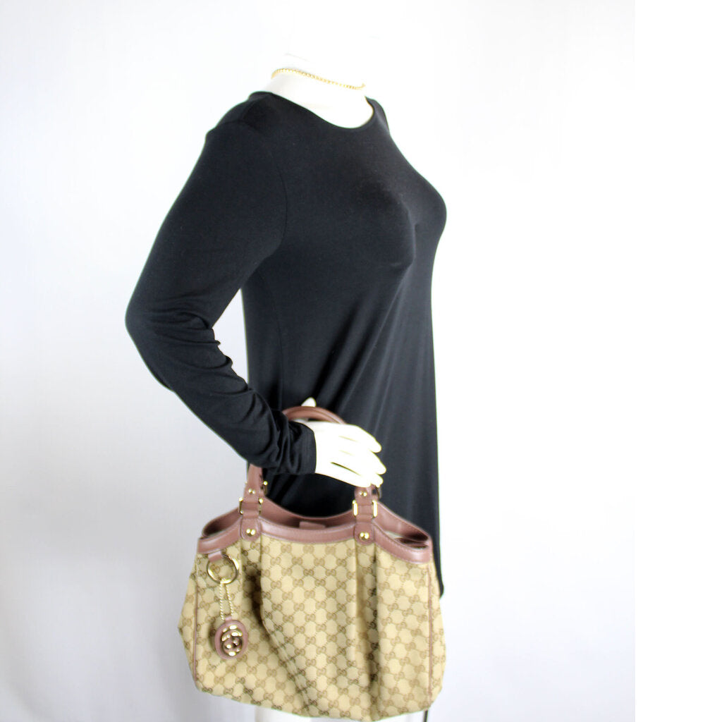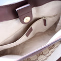 This Gucci Sukey Mediumis eye catching bag. The exterior is in the Gucci canvas.