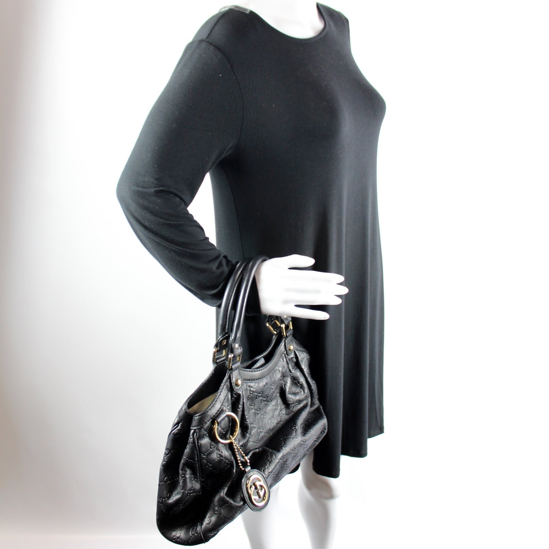 This Gucci Sukey Mediumis eye catching bag. The exterior is in the classic Gucci Guccissima leather.